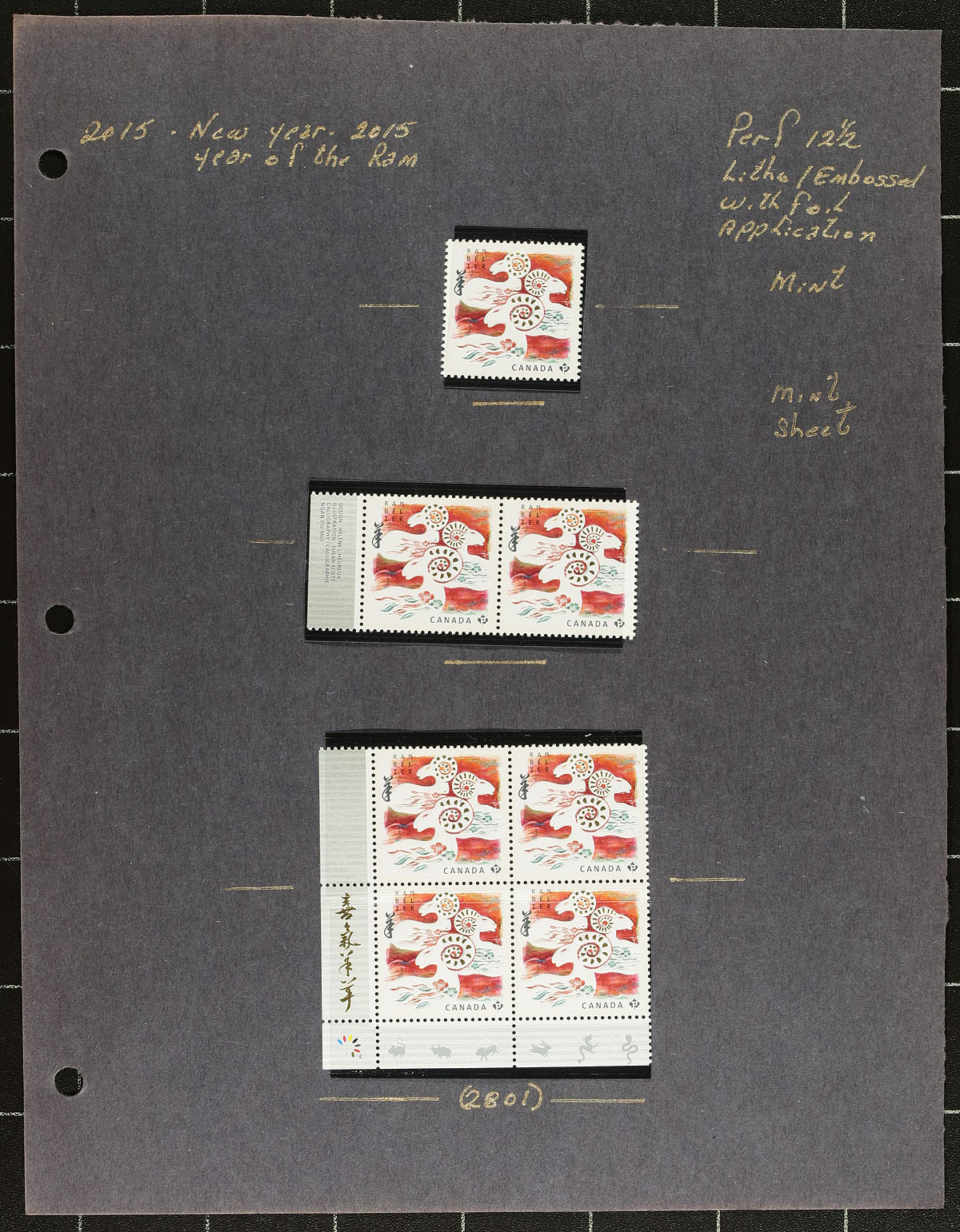 Lovely collection of primarily mint never hinged "Lunar New Year- Year of the Ram", January 2015, covering Unitrade #s 2801-2803, all in hingeless mounts in 18 well described pages. The collection contains mint and used singles (including booklet stamps), 2 mint sheets, matched set of mint plate blocks, mint and used souvenir sheets, booklets, and a few first day covers. Face value alone totals $162 (including 81x "P" value stamps). A lovely collection for any Canada collector. 2024 Unitrade =