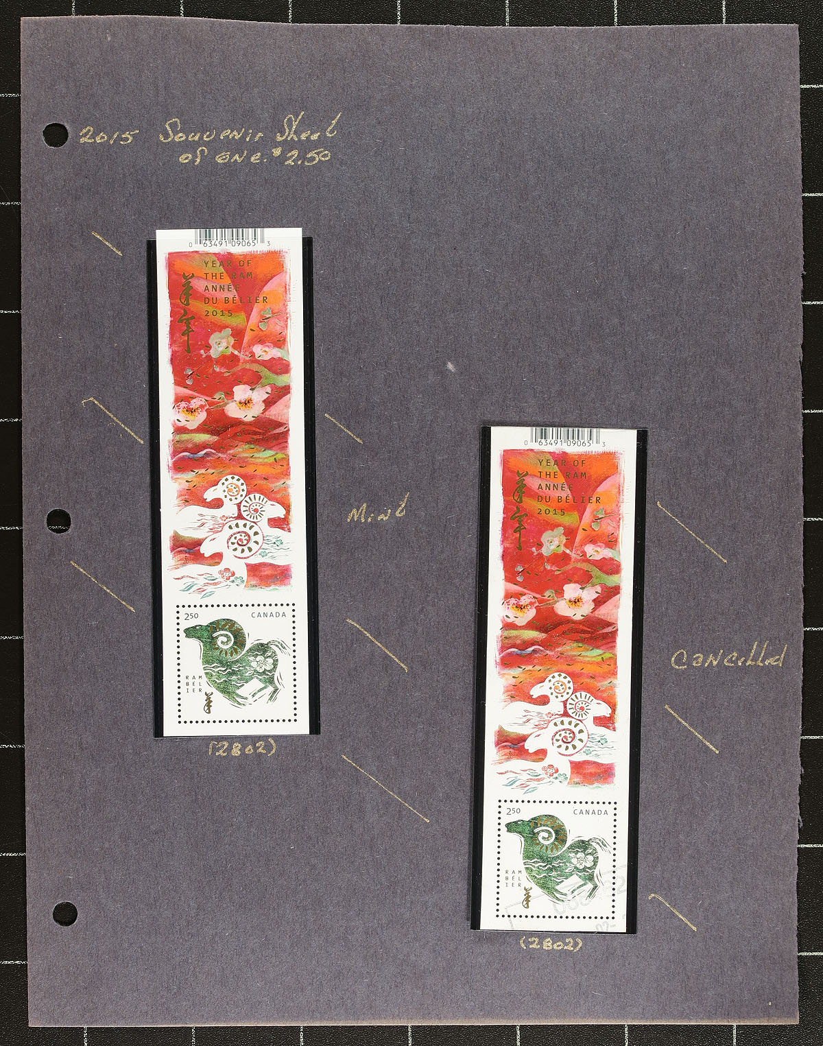 Lovely collection of primarily mint never hinged "Lunar New Year- Year of the Ram", January 2015, covering Unitrade #s 2801-2803, all in hingeless mounts in 18 well described pages. The collection contains mint and used singles (including booklet stamps), 2 mint sheets, matched set of mint plate blocks, mint and used souvenir sheets, booklets, and a few first day covers. Face value alone totals $162 (including 81x "P" value stamps). A lovely collection for any Canada collector. 2024 Unitrade =