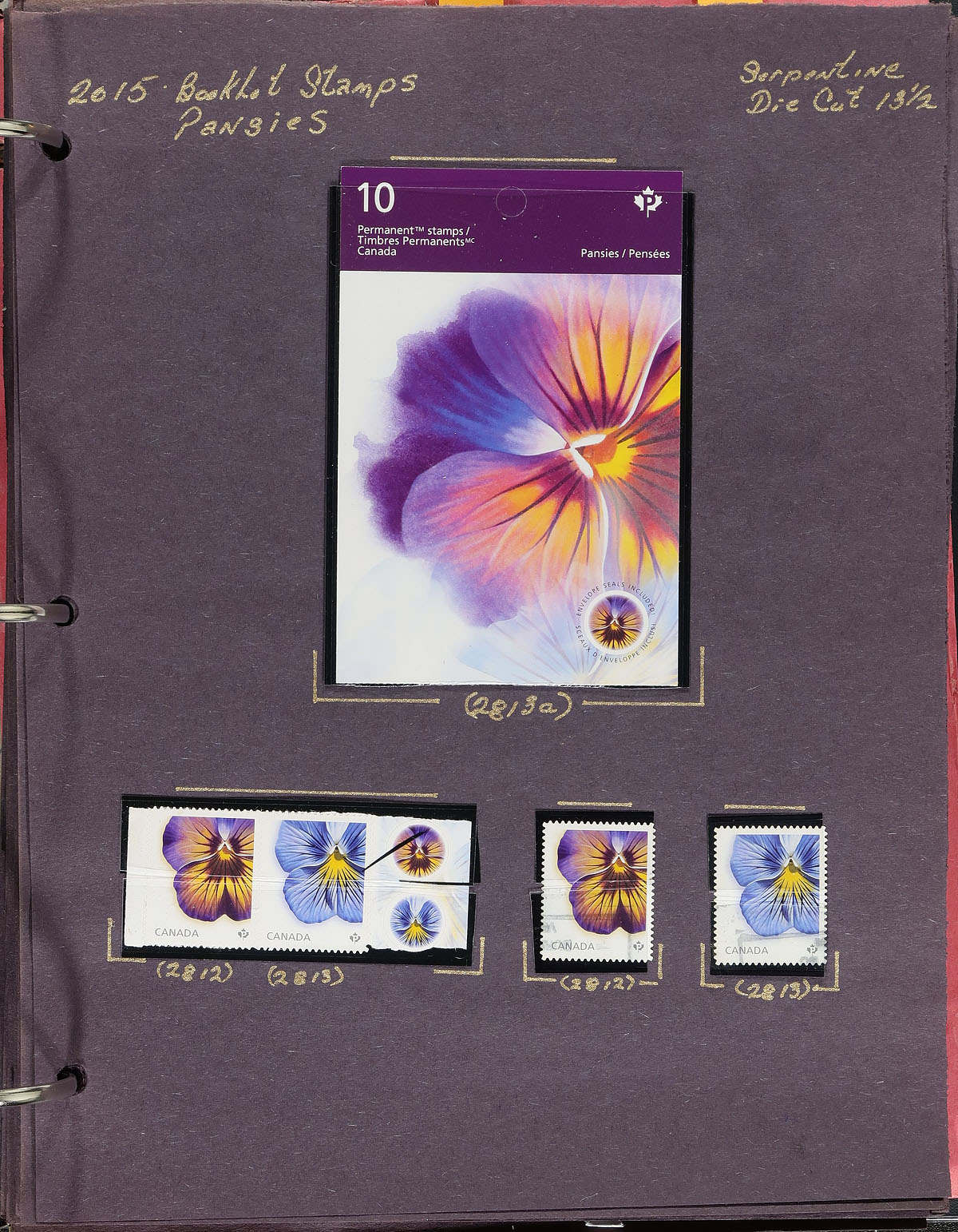 Lovely collection of primarily mint never hinged Canada, from January to March, 2015, covering Unitrade #s 2804-2813, all in hingeless mounts in roughly 35 well described pages housed in a binder. The collection primarily contains mint and used singles (including booklet stamps), coil singles, pairs, strips of 4, booklet panes, mint and used souvenir sheet, and a few first day covers. We note items cataloguing $15 and up. Face value alone totals $238.00 (counting 187x "P" stamps). A nice lot for Canada collectors. 2024 Unitrade =