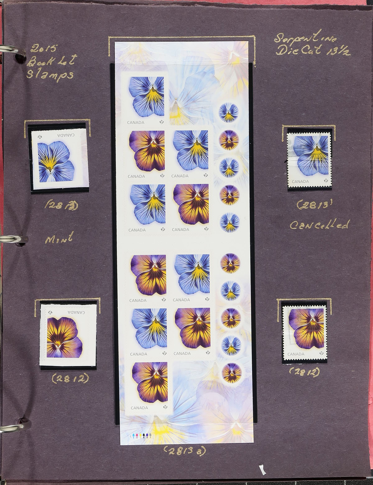 Lovely collection of primarily mint never hinged Canada, from January to March, 2015, covering Unitrade #s 2804-2813, all in hingeless mounts in roughly 35 well described pages housed in a binder. The collection primarily contains mint and used singles (including booklet stamps), coil singles, pairs, strips of 4, booklet panes, mint and used souvenir sheet, and a few first day covers. We note items cataloguing $15 and up. Face value alone totals $238.00 (counting 187x "P" stamps). A nice lot for Canada collectors. 2024 Unitrade =
