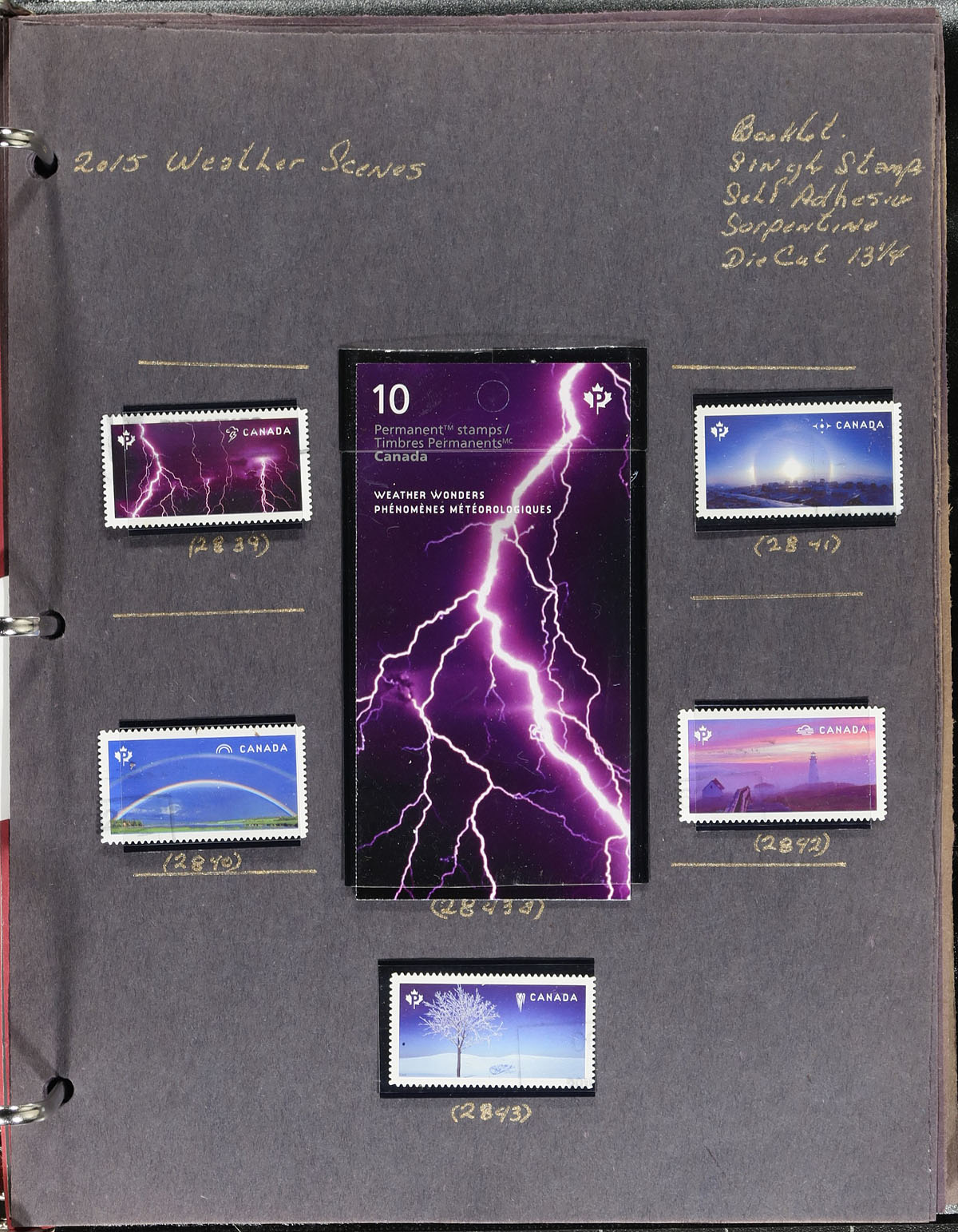 Clean collection of primarily mint never hinged Canada, from May to June 2015, covering Unitrade #s 2829-2843, all in hingeless mounts in roughly 30 well described pages housed in a binder. The collection primarily contains mint and used singles (including booklet stamps), booklet panes, mint and used souvenir sheets, and roughly 10 first day covers (most having lower mainland B.C. postmarks. We note a few items cataloguing $15 and up. Face value alone totals $219.00 (noting 178x "P" stamps). A very nice lot for all Canada collectors. 2024 Unitrade =