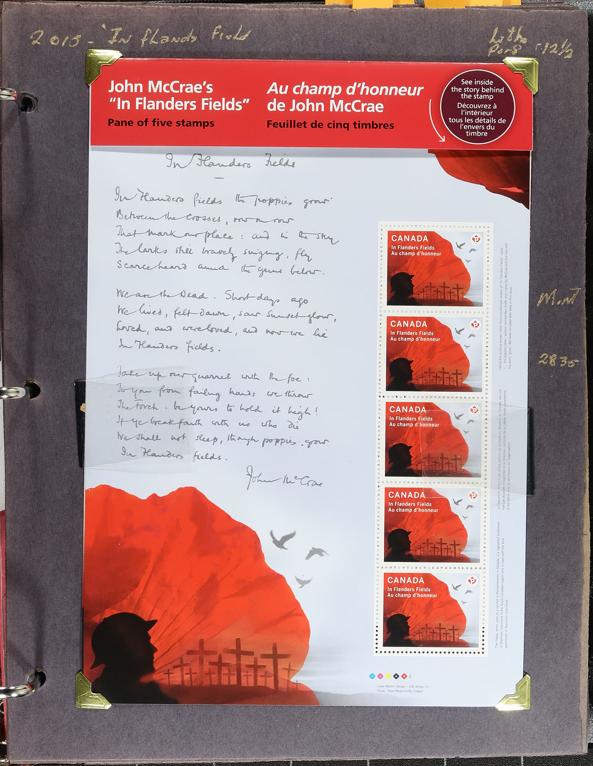 Clean collection of primarily mint never hinged Canada, from May to June 2015, covering Unitrade #s 2829-2843, all in hingeless mounts in roughly 30 well described pages housed in a binder. The collection primarily contains mint and used singles (including booklet stamps), booklet panes, mint and used souvenir sheets, and roughly 10 first day covers (most having lower mainland B.C. postmarks. We note a few items cataloguing $15 and up. Face value alone totals $219.00 (noting 178x "P" stamps). A very nice lot for all Canada collectors. 2024 Unitrade =