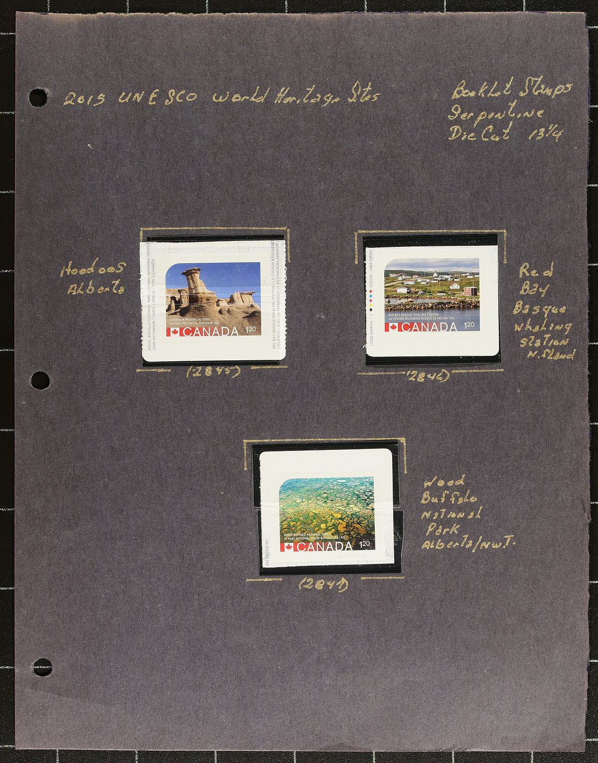 Collection of primarily mint never hinged UNESCO World Heritage Sites in Canada booklet issues, July to August, covering Unitrade #s 2845-2849, 2858, all in hingeless mounts in roughly 15 well described pages. The collection contains mint and used booklet singles, part panes, and complete booklets, along with a few first day covers. We note a few items catalogue $15 and up, including 2845 "Hoodoos" single (c.v. $50). Face value alone totals $109.00. A nice collection from this popular issue. 2024 Unitrade =
