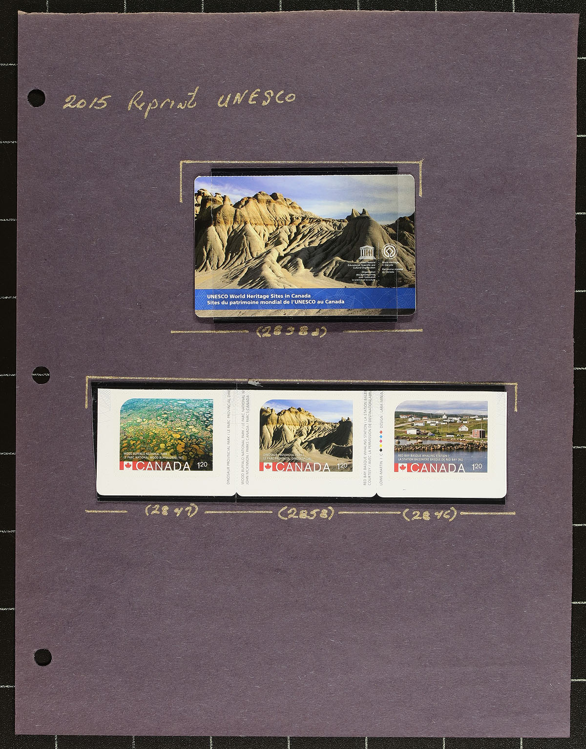 Collection of primarily mint never hinged UNESCO World Heritage Sites in Canada booklet issues, July to August, covering Unitrade #s 2845-2849, 2858, all in hingeless mounts in roughly 15 well described pages. The collection contains mint and used booklet singles, part panes, and complete booklets, along with a few first day covers. We note a few items catalogue $15 and up, including 2845 "Hoodoos" single (c.v. $50). Face value alone totals $109.00. A nice collection from this popular issue. 2024 Unitrade =