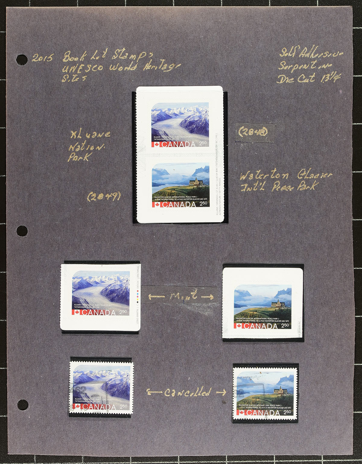 Collection of primarily mint never hinged UNESCO World Heritage Sites in Canada booklet issues, July to August, covering Unitrade #s 2845-2849, 2858, all in hingeless mounts in roughly 15 well described pages. The collection contains mint and used booklet singles, part panes, and complete booklets, along with a few first day covers. We note a few items catalogue $15 and up, including 2845 "Hoodoos" single (c.v. $50). Face value alone totals $109.00. A nice collection from this popular issue. 2024 Unitrade =