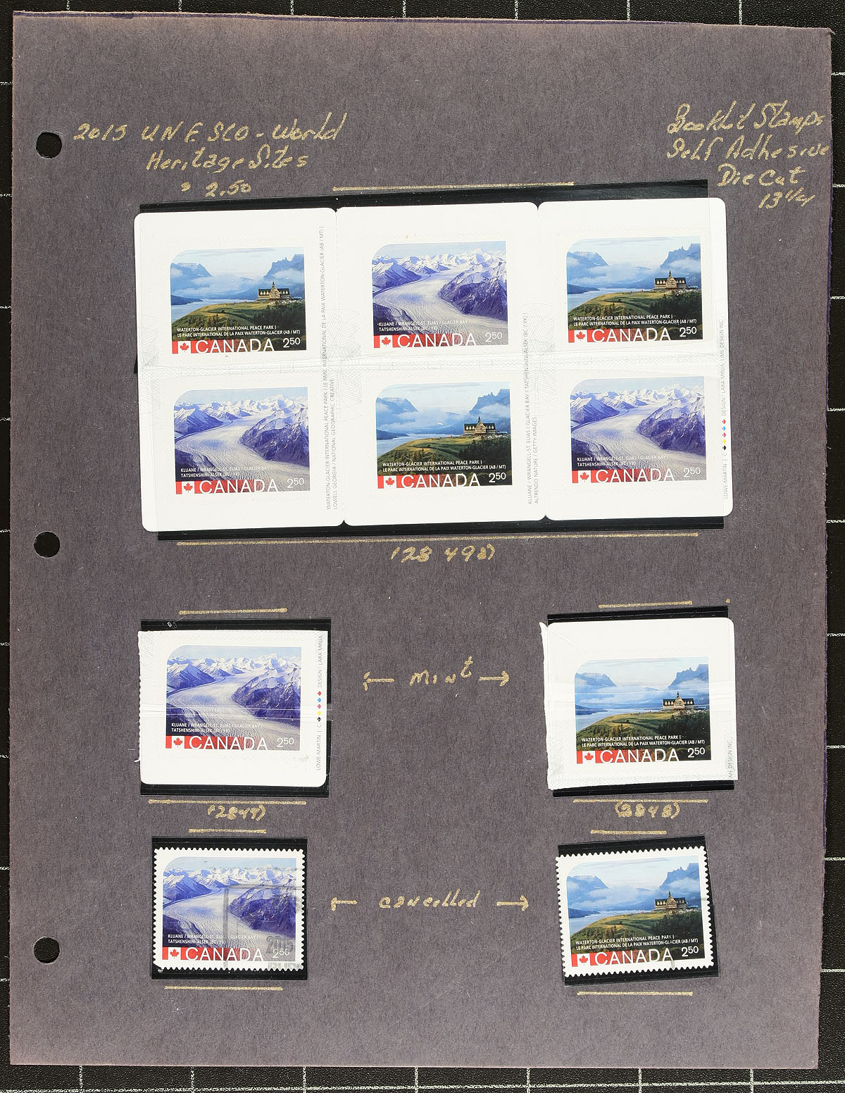 Collection of primarily mint never hinged UNESCO World Heritage Sites in Canada booklet issues, July to August, covering Unitrade #s 2845-2849, 2858, all in hingeless mounts in roughly 15 well described pages. The collection contains mint and used booklet singles, part panes, and complete booklets, along with a few first day covers. We note a few items catalogue $15 and up, including 2845 "Hoodoos" single (c.v. $50). Face value alone totals $109.00. A nice collection from this popular issue. 2024 Unitrade =