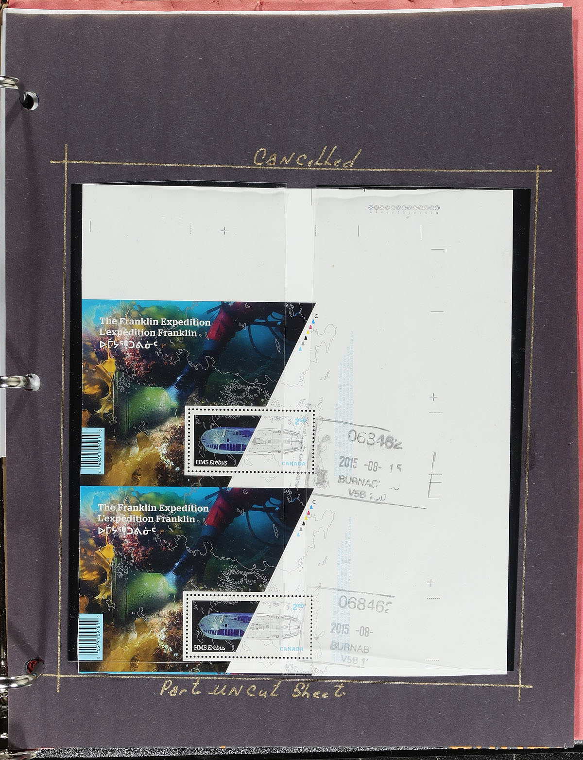 Lovely collection of primarily mint never hinged Canada, from July to August 2015, covering Unitrade #s 2850-2856, all in hingeless mounts in roughly 30 well described pages housed in a binder. The collection primarily contains mint and used singles (including booklet stamps), booklet panes, mint and used souvenir sheets, sheetlets, multiples, and roughly 10 first day covers (most having lower mainland B.C. postmarks. We note a few items cataloguing $15 and up. Face value alone totals $260.00 (noting 154x "P" stamps). A very nice lot for all Canada collectors. 2024 Unitrade =