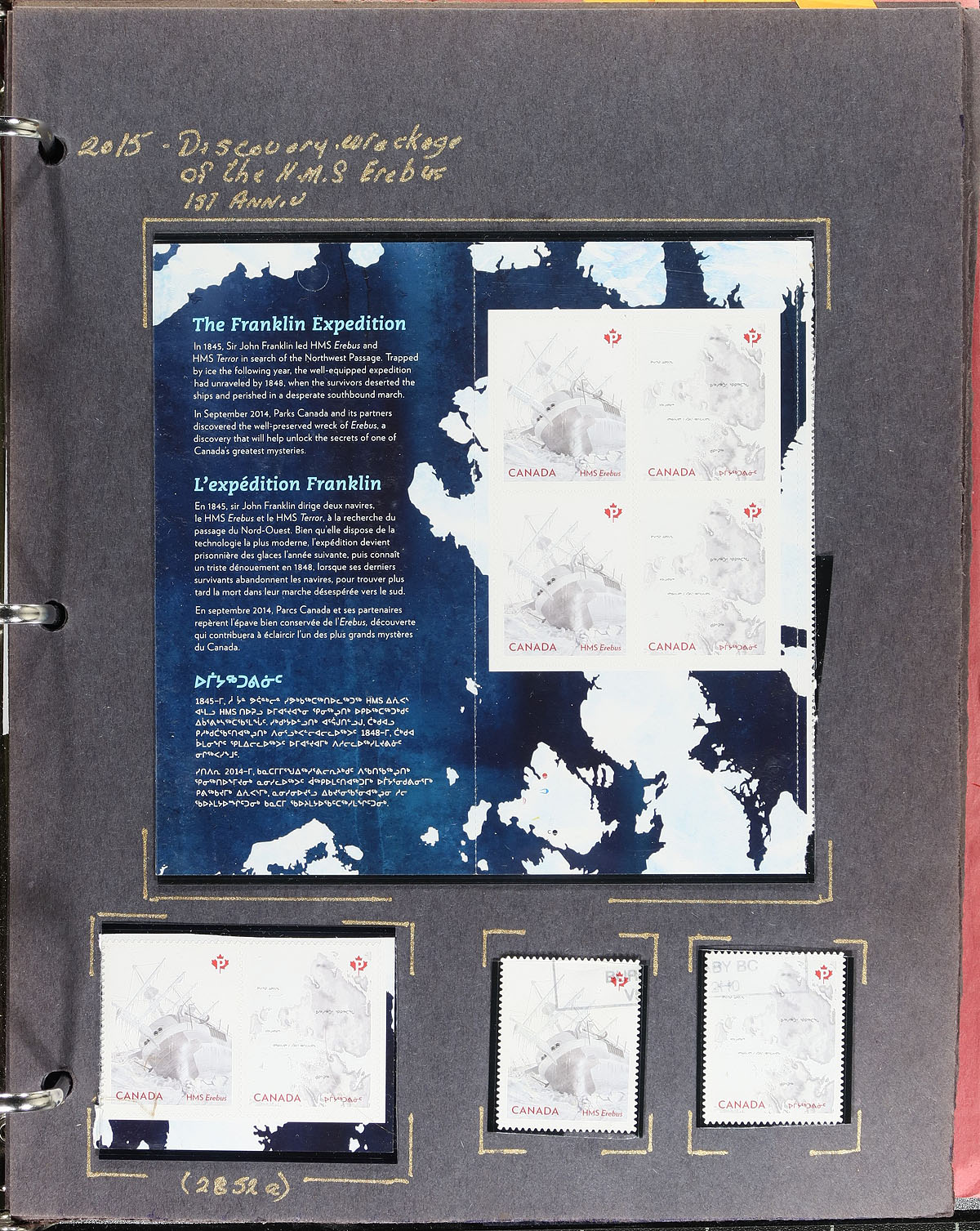 Lovely collection of primarily mint never hinged Canada, from July to August 2015, covering Unitrade #s 2850-2856, all in hingeless mounts in roughly 30 well described pages housed in a binder. The collection primarily contains mint and used singles (including booklet stamps), booklet panes, mint and used souvenir sheets, sheetlets, multiples, and roughly 10 first day covers (most having lower mainland B.C. postmarks. We note a few items cataloguing $15 and up. Face value alone totals $260.00 (noting 154x "P" stamps). A very nice lot for all Canada collectors. 2024 Unitrade =