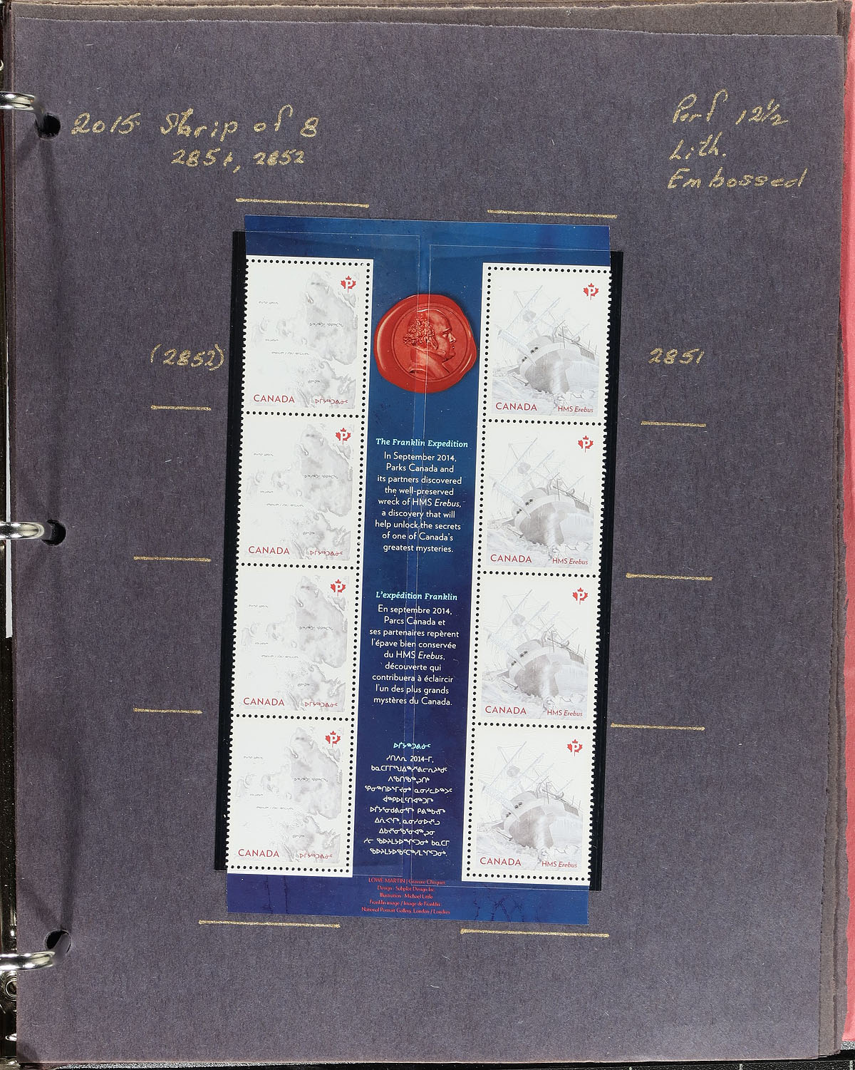 Lovely collection of primarily mint never hinged Canada, from July to August 2015, covering Unitrade #s 2850-2856, all in hingeless mounts in roughly 30 well described pages housed in a binder. The collection primarily contains mint and used singles (including booklet stamps), booklet panes, mint and used souvenir sheets, sheetlets, multiples, and roughly 10 first day covers (most having lower mainland B.C. postmarks. We note a few items cataloguing $15 and up. Face value alone totals $260.00 (noting 154x "P" stamps). A very nice lot for all Canada collectors. 2024 Unitrade =