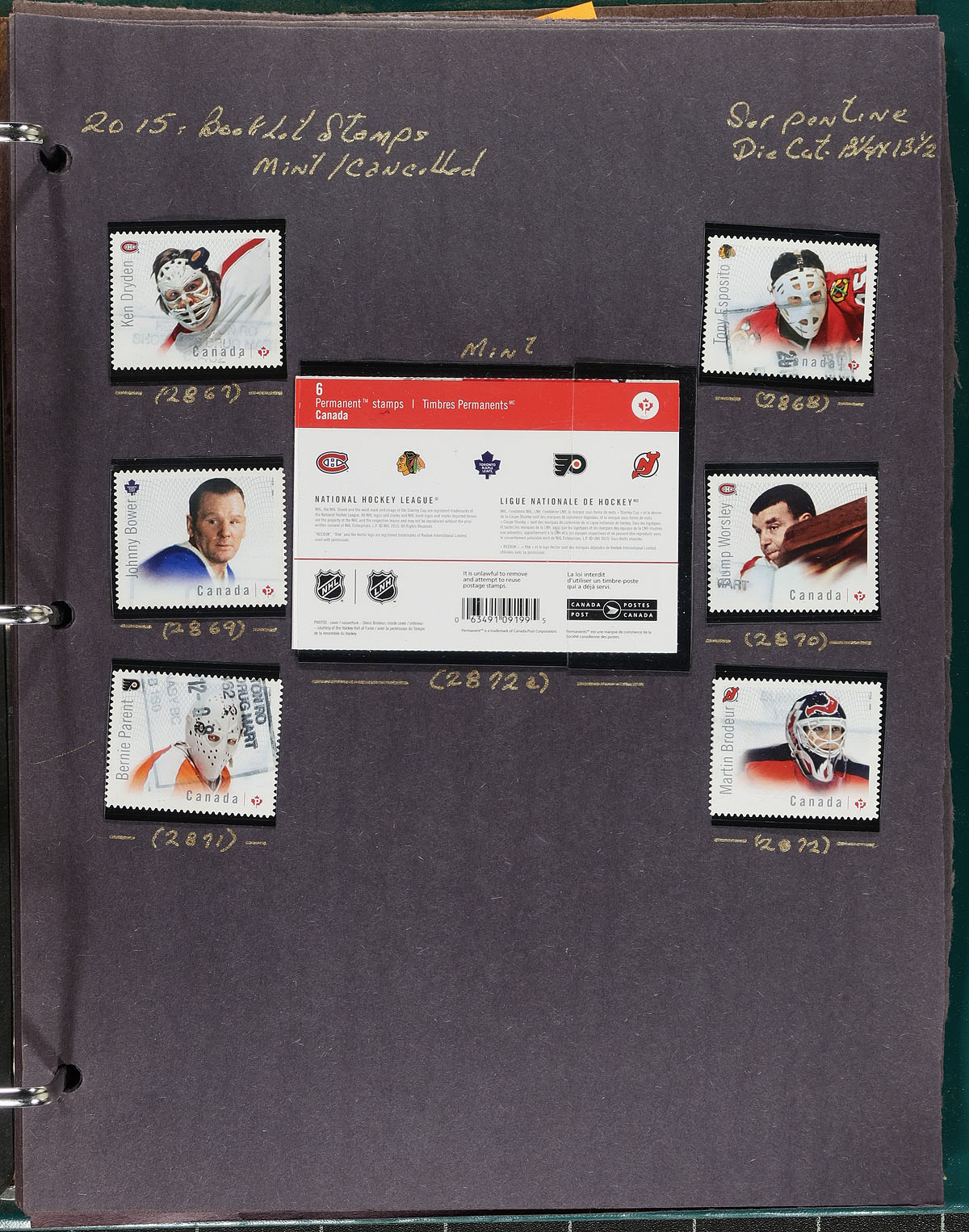 Lovely collection of primarily mint never hinged Canada, from September to October 2015, covering Unitrade #s 2859-2878, all in hingeless mounts in roughly 30 well described pages housed in a binder. The collection primarily contains mint and used singles (including booklet stamps), booklet panes, booklets, mint and used souvenir sheets, along with roughly 15 first day covers (most having lower mainland B.C. postmarks). We note a few items cataloguing $15 and up. Face value alone totals $154.00 (includes 106x "P" stamps). A nice clean offering for Canada collectors. 2024 Unitrade =