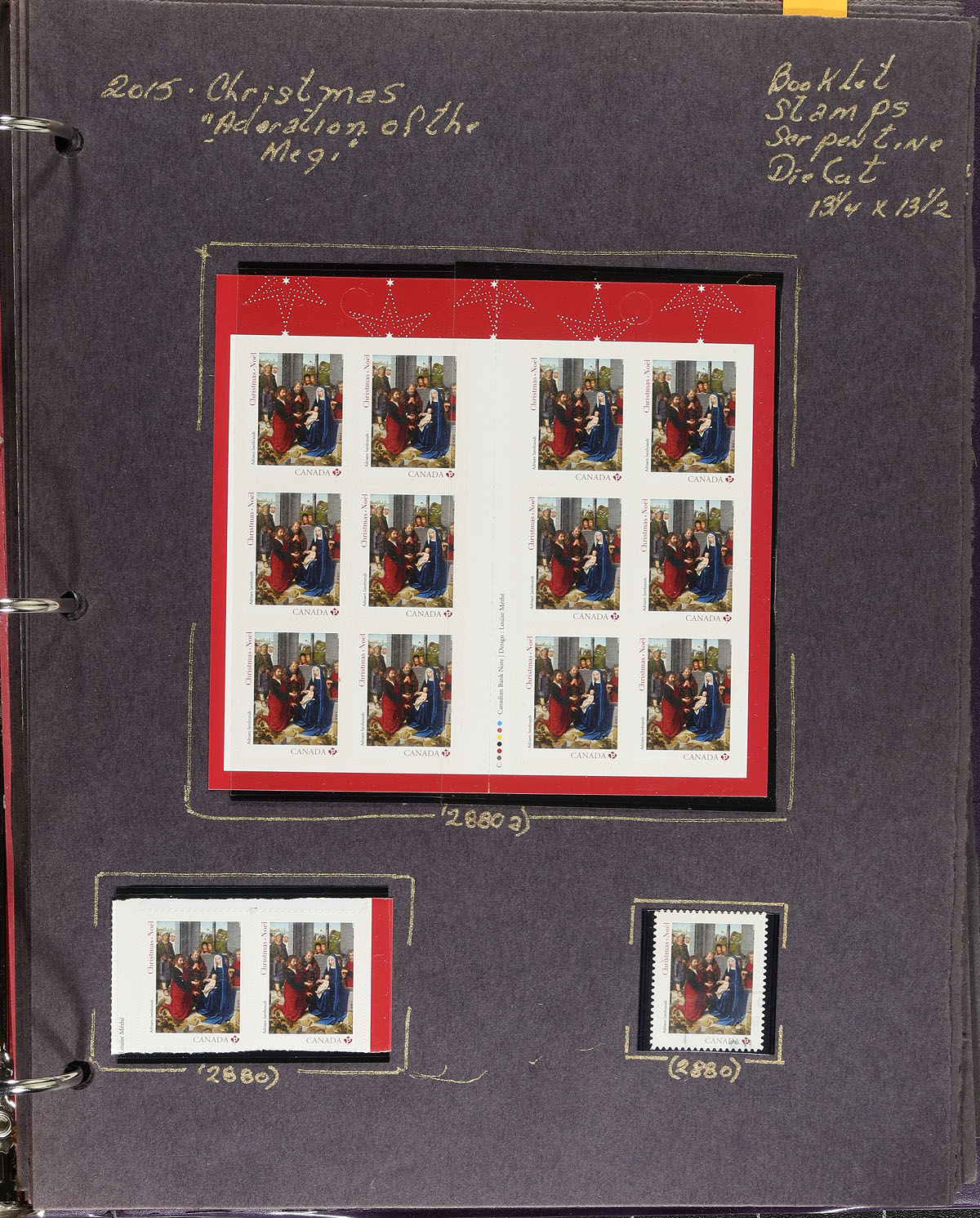 Lovely collection of primarily of mint never hinged Christmas issues, November 2015, covering Unitrade #s 2879-2883, all in hingeless mounts in roughly 15 well described pages housed in a binder. The collection primarily contains mint and used booklet stamps, part panes, complete booklets, and a few first day covers (most having lower mainland B.C. postmarks). We note a few items cataloguing $15 and up. Face value alone totals over $200.00 (noting 99x "P" stamps). A clean collection for the Canada Christmas collector. 2024 Unitrade =