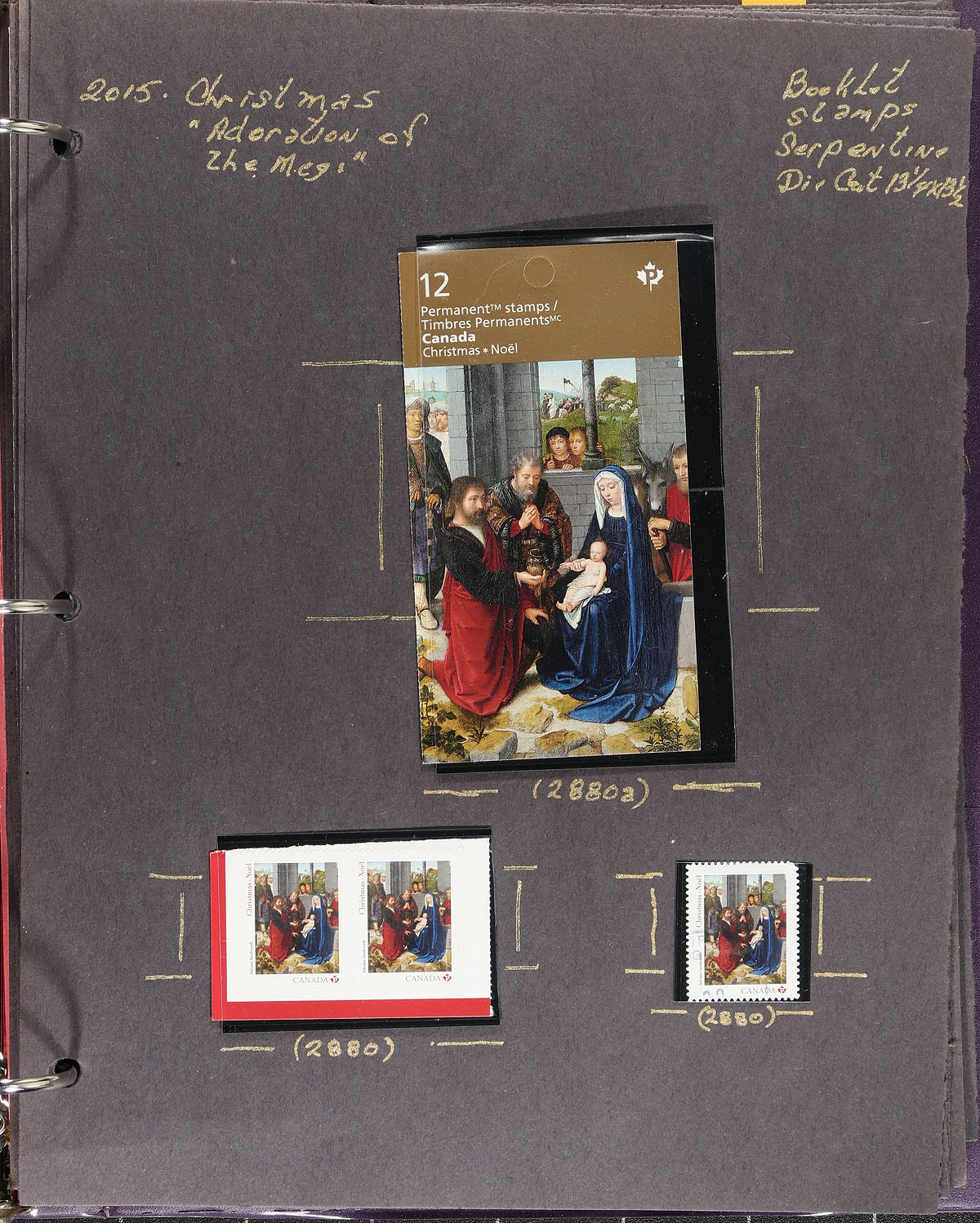 Lovely collection of primarily of mint never hinged Christmas issues, November 2015, covering Unitrade #s 2879-2883, all in hingeless mounts in roughly 15 well described pages housed in a binder. The collection primarily contains mint and used booklet stamps, part panes, complete booklets, and a few first day covers (most having lower mainland B.C. postmarks). We note a few items cataloguing $15 and up. Face value alone totals over $200.00 (noting 99x "P" stamps). A clean collection for the Canada Christmas collector. 2024 Unitrade =