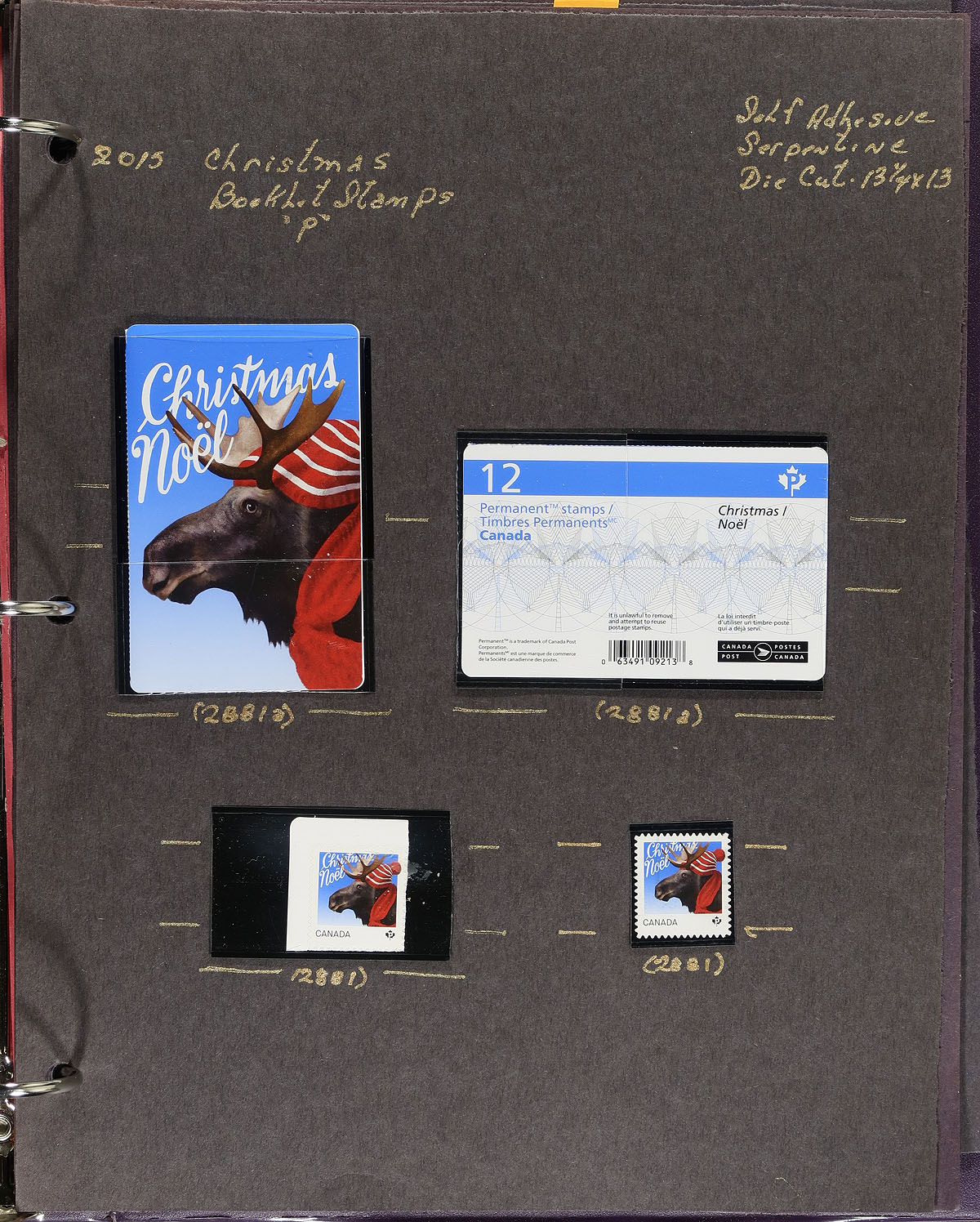 Lovely collection of primarily of mint never hinged Christmas issues, November 2015, covering Unitrade #s 2879-2883, all in hingeless mounts in roughly 15 well described pages housed in a binder. The collection primarily contains mint and used booklet stamps, part panes, complete booklets, and a few first day covers (most having lower mainland B.C. postmarks). We note a few items cataloguing $15 and up. Face value alone totals over $200.00 (noting 99x "P" stamps). A clean collection for the Canada Christmas collector. 2024 Unitrade =