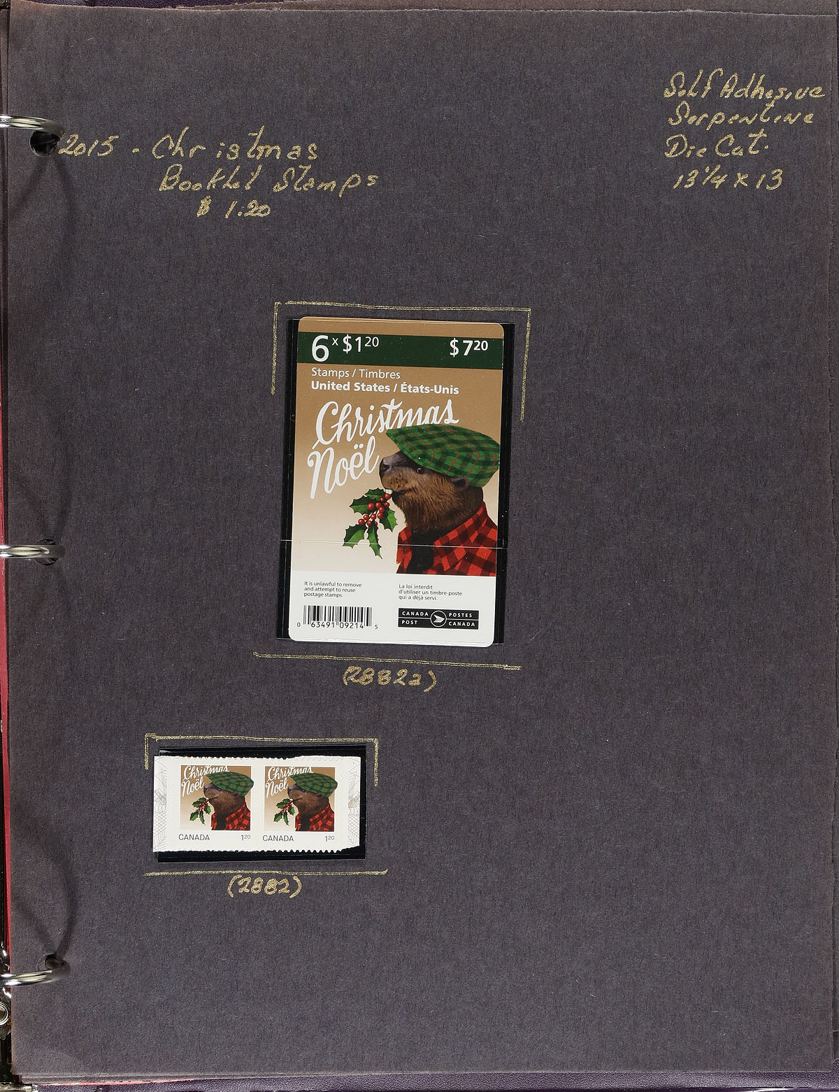 Lovely collection of primarily of mint never hinged Christmas issues, November 2015, covering Unitrade #s 2879-2883, all in hingeless mounts in roughly 15 well described pages housed in a binder. The collection primarily contains mint and used booklet stamps, part panes, complete booklets, and a few first day covers (most having lower mainland B.C. postmarks). We note a few items cataloguing $15 and up. Face value alone totals over $200.00 (noting 99x "P" stamps). A clean collection for the Canada Christmas collector. 2024 Unitrade =