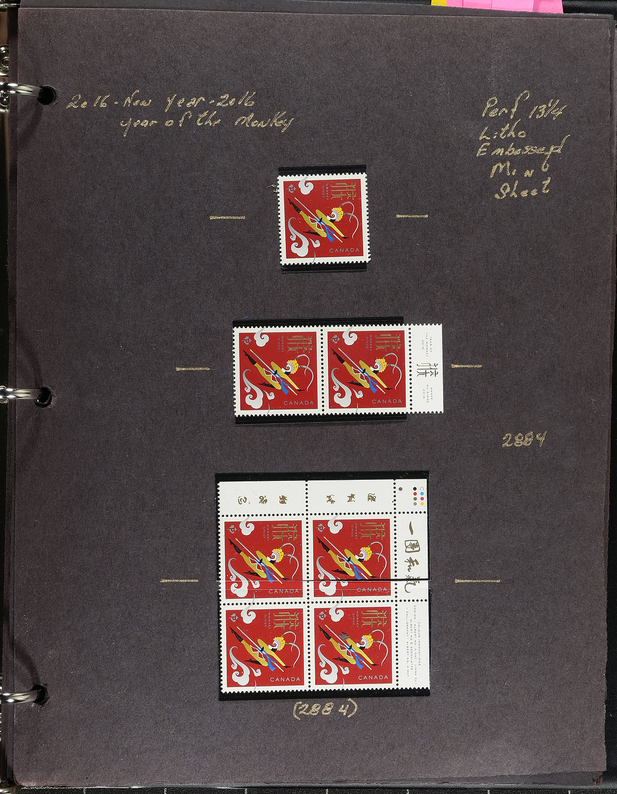 Lovely collection of primarily mint never hinged "Lunar New Year- Year of the Monkey", January to February 2016, covering Unitrade #s 2884-2886, all in hingeless mounts in roughly 15 well described pages housed in a binder. The collection contains mint and used singles (including booklet stamps), sheetlet, mint and used matched set of plate blocks, mint and used souvenir sheets, booklets, and a few first day covers. Face value alone totals $136.00 (including 100x "P" value stamps). A lovely collection for any Canada collector. 2024 Unitrade =