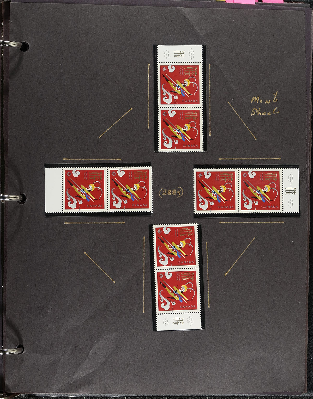 Lovely collection of primarily mint never hinged "Lunar New Year- Year of the Monkey", January to February 2016, covering Unitrade #s 2884-2886, all in hingeless mounts in roughly 15 well described pages housed in a binder. The collection contains mint and used singles (including booklet stamps), sheetlet, mint and used matched set of plate blocks, mint and used souvenir sheets, booklets, and a few first day covers. Face value alone totals $136.00 (including 100x "P" value stamps). A lovely collection for any Canada collector. 2024 Unitrade =