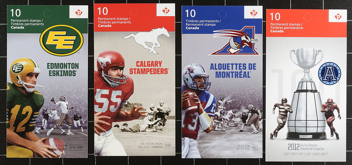 VF mint complete set of the 2012 issued "100th Grey Cup Game" booklets (9 in total still in the Post Office sealed plastic), plus the matching VF NH souvenir sheet of 9 values, and lastly the later issued 2012 Toronto Argonauts Grey Cup Winners booklet. A very clean assembly, which has been tough to find after issue due to the high original cost and cross-interest with sports collectable collectors. Face value alone is $135.16. 2024 Unitrade =