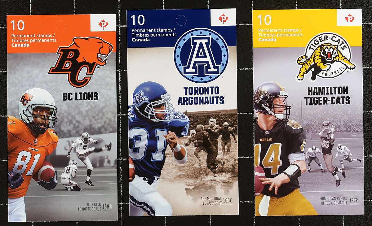 VF mint complete set of the 2012 issued "100th Grey Cup Game" booklets (9 in total still in the Post Office sealed plastic), plus the matching VF NH souvenir sheet of 9 values, and lastly the later issued 2012 Toronto Argonauts Grey Cup Winners booklet. A very clean assembly, which has been tough to find after issue due to the high original cost and cross-interest with sports collectable collectors. Face value alone is $135.16. 2024 Unitrade =