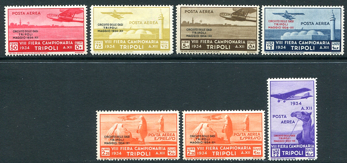 A complete set of the Libyan "Circuit of the Oases" air mail and air mail special delivery issues overprinted in 1934 for use in Tripolitania. With 1930's imagery such as planes over landscapes, locals and a camel. Seven fresh mint, hinged, stamps. 2024 Scott US$495.00 =
