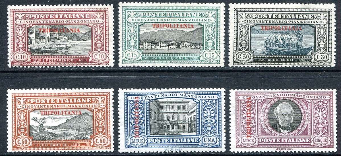 The 1923 Italian "Manzioni" issue overprinted the following year with "Tripolitania" in red. One of the key early sets of this North African colony. Fresh mint, with moderate hinging, the high value having a small remnant. 2024 Scott US$499.00 =