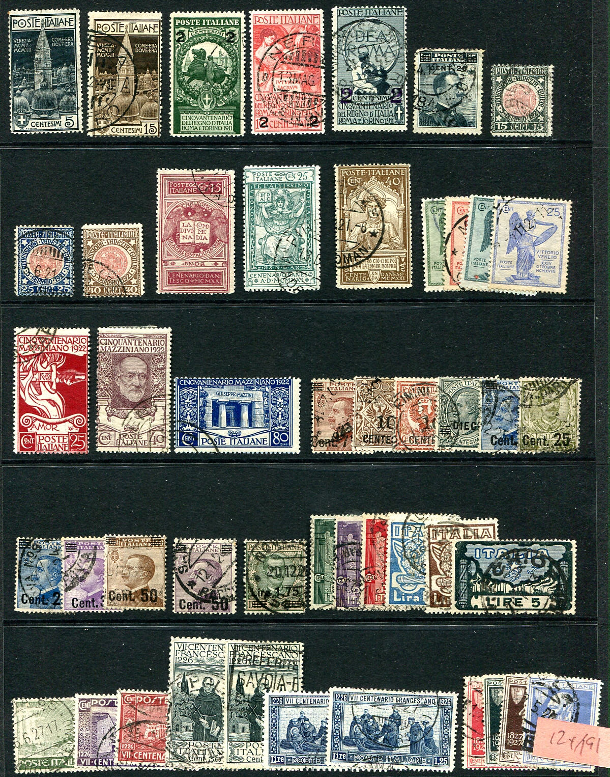 One stockpage filled with 1910's-1920's used definitives and commemoratives, including the Venice Campanile, the trios of the "Old Seal of Trieste" and "Dante", some overprinted revaluations, the 1923 Fascist March anniversary, the St. Francis set to 1.25 lira (plus a couple of perforation variants), finishing with the 1927 Volta set. Nicely used, a few with "socked on the nose" cancellations. Mixed centering as is often seen, but overall are in better condition than normally seen. 2024 Scott US$775.00 =