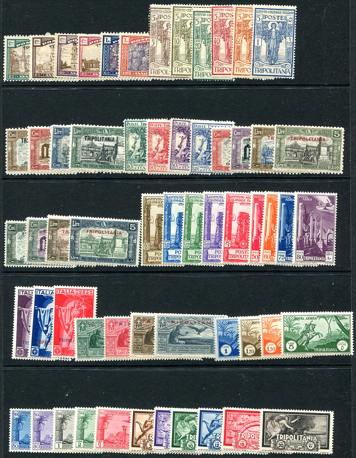 Overprints on Italian issues or Italian-colonies designs. A complete mint run of 33 semi-postals (there are lots of gaps in the Scott numbering) and all the air mail stamps issued up to the 1933 Graf Zeppelin issue. An attractive mint grouping. All are hinged, but many have the lightest of hinging. 2024 Scott US$472.95 =
