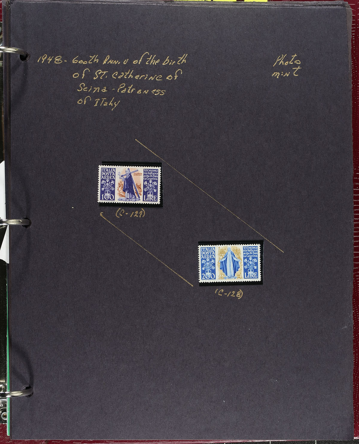 Quality collection of mint and used back of the book Italy, containing a few hundred stamps (mostly sets), all in hingeless mounts, on well described pages housed in a binder. The collection primarily contains mint airmails, along with semi-postals, postage dues, special delivery, and pneumatic posts. Just a few of the better items include, with Scott #s B17-B19 (lh, $97 total), B30-B33 (lh, $113 total), B39-B42 (used, $103 total), C89-C94 (lh, $96 total), D1-D3, D5-D8 (lh, $106 total), along with many stamps and sets cataloguing $20 to $60 and up each. A spot check indicates lightly hinged stamps, with the possibility of a few never hinged stamps within. A lovely collection with online photos showing a sampling. 2025 Scott US$2,011.00 =