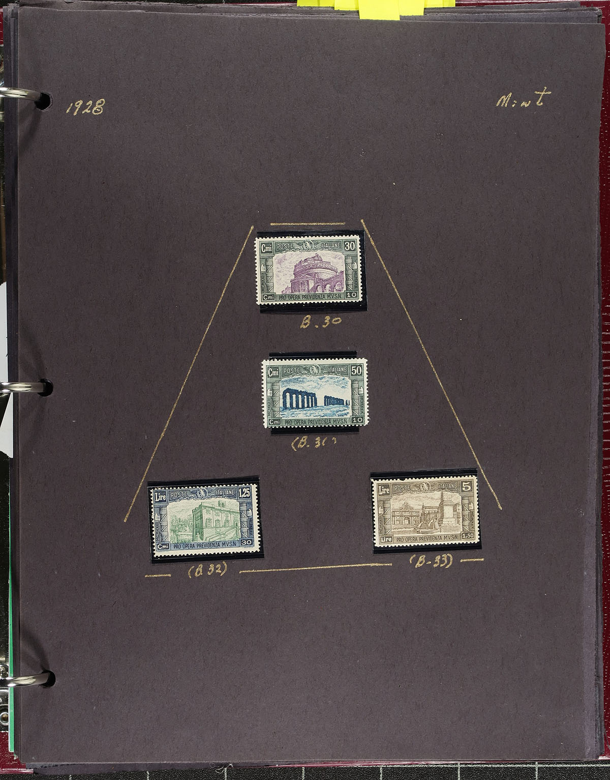 Quality collection of mint and used back of the book Italy, containing a few hundred stamps (mostly sets), all in hingeless mounts, on well described pages housed in a binder. The collection primarily contains mint airmails, along with semi-postals, postage dues, special delivery, and pneumatic posts. Just a few of the better items include, with Scott #s B17-B19 (lh, $97 total), B30-B33 (lh, $113 total), B39-B42 (used, $103 total), C89-C94 (lh, $96 total), D1-D3, D5-D8 (lh, $106 total), along with many stamps and sets cataloguing $20 to $60 and up each. A spot check indicates lightly hinged stamps, with the possibility of a few never hinged stamps within. A lovely collection with online photos showing a sampling. 2025 Scott US$2,011.00 =