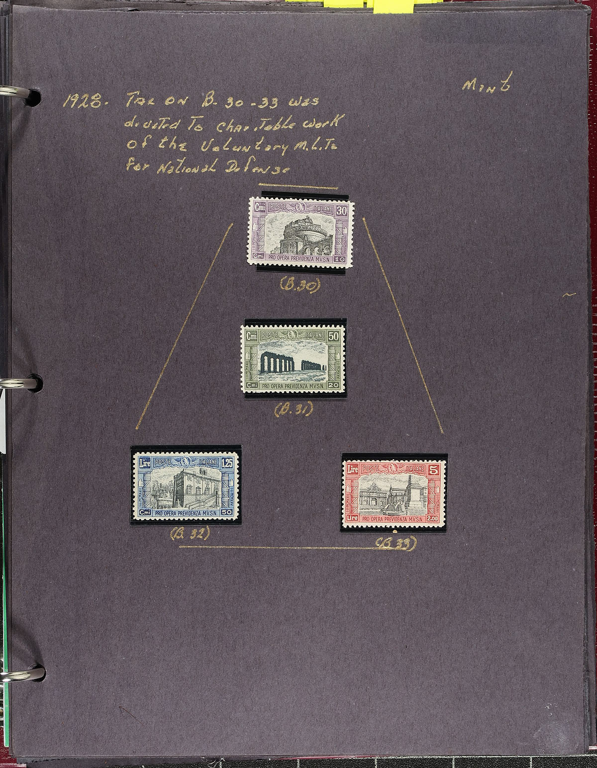 Quality collection of mint and used back of the book Italy, containing a few hundred stamps (mostly sets), all in hingeless mounts, on well described pages housed in a binder. The collection primarily contains mint airmails, along with semi-postals, postage dues, special delivery, and pneumatic posts. Just a few of the better items include, with Scott #s B17-B19 (lh, $97 total), B30-B33 (lh, $113 total), B39-B42 (used, $103 total), C89-C94 (lh, $96 total), D1-D3, D5-D8 (lh, $106 total), along with many stamps and sets cataloguing $20 to $60 and up each. A spot check indicates lightly hinged stamps, with the possibility of a few never hinged stamps within. A lovely collection with online photos showing a sampling. 2025 Scott US$2,011.00 =