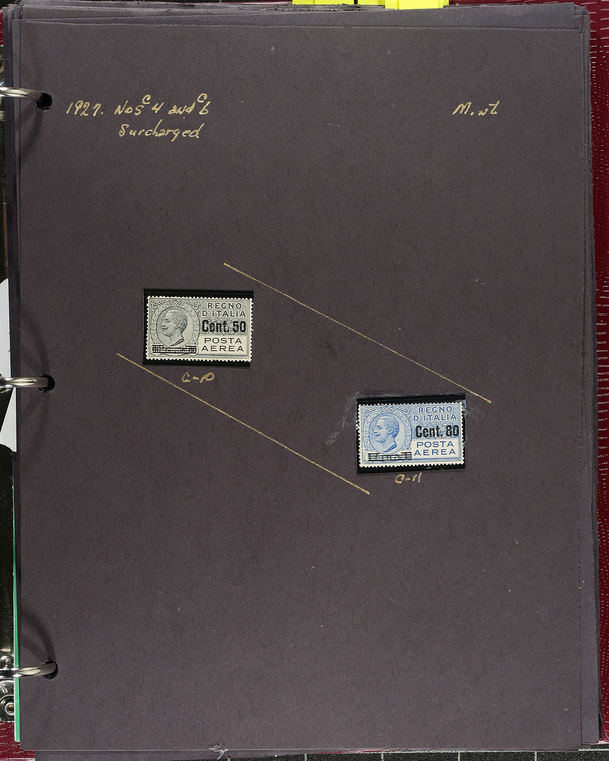 Quality collection of mint and used back of the book Italy, containing a few hundred stamps (mostly sets), all in hingeless mounts, on well described pages housed in a binder. The collection primarily contains mint airmails, along with semi-postals, postage dues, special delivery, and pneumatic posts. Just a few of the better items include, with Scott #s B17-B19 (lh, $97 total), B30-B33 (lh, $113 total), B39-B42 (used, $103 total), C89-C94 (lh, $96 total), D1-D3, D5-D8 (lh, $106 total), along with many stamps and sets cataloguing $20 to $60 and up each. A spot check indicates lightly hinged stamps, with the possibility of a few never hinged stamps within. A lovely collection with online photos showing a sampling. 2025 Scott US$2,011.00 =