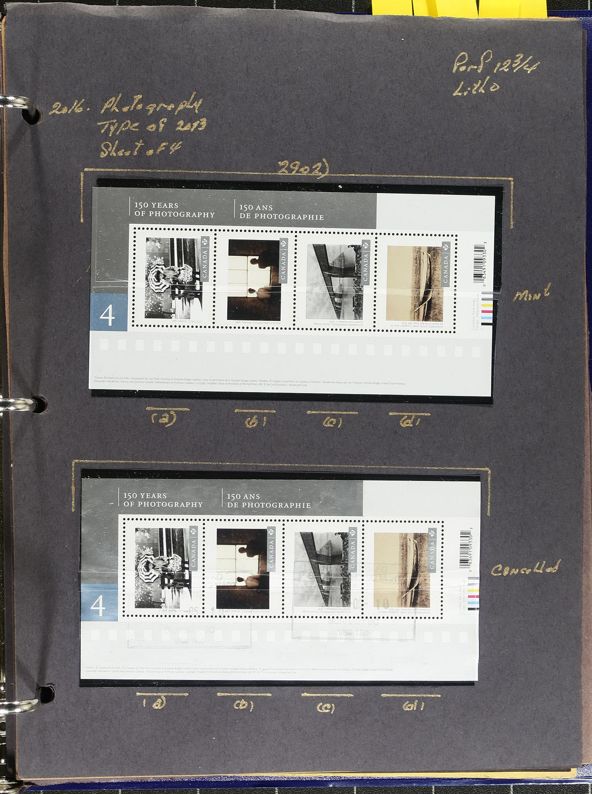 Specialized collection of primarily mint never hinged "Canadian Photography- 4" issues, from April 2016, covering Unitrade #s 2902-2910, all in hingeless mounts in roughly 20 described pages housed in a binder. The collection primarily contains mint and used booklet stamps, complete booklets and part panes, mint and used souvenir sheets, and roughly 10 first day covers (includes a few official first days, with the majority having lower mainland B.C. postmarks). We note some items cataloguing $15 and up. Face value alone totals $123.00 (including 39x "P" stamps). A lovely lot that would be difficult to duplicate. 2024 Unitrade =