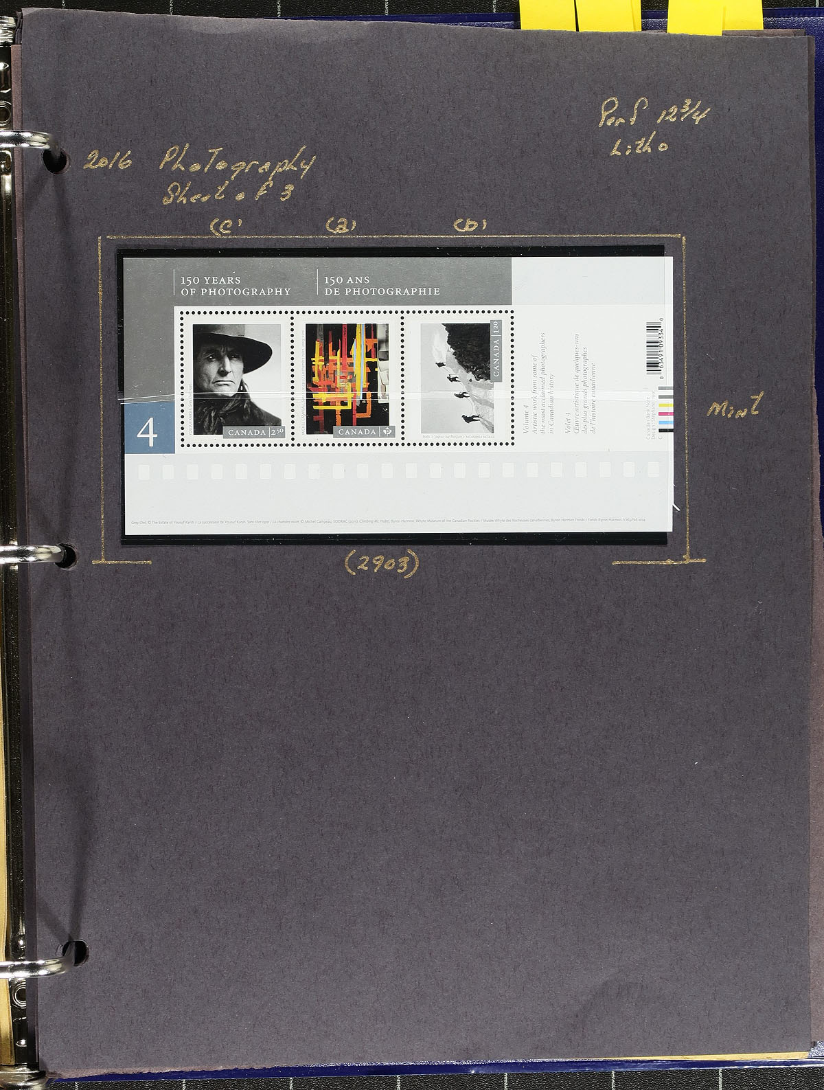 Specialized collection of primarily mint never hinged "Canadian Photography- 4" issues, from April 2016, covering Unitrade #s 2902-2910, all in hingeless mounts in roughly 20 described pages housed in a binder. The collection primarily contains mint and used booklet stamps, complete booklets and part panes, mint and used souvenir sheets, and roughly 10 first day covers (includes a few official first days, with the majority having lower mainland B.C. postmarks). We note some items cataloguing $15 and up. Face value alone totals $123.00 (including 39x "P" stamps). A lovely lot that would be difficult to duplicate. 2024 Unitrade =