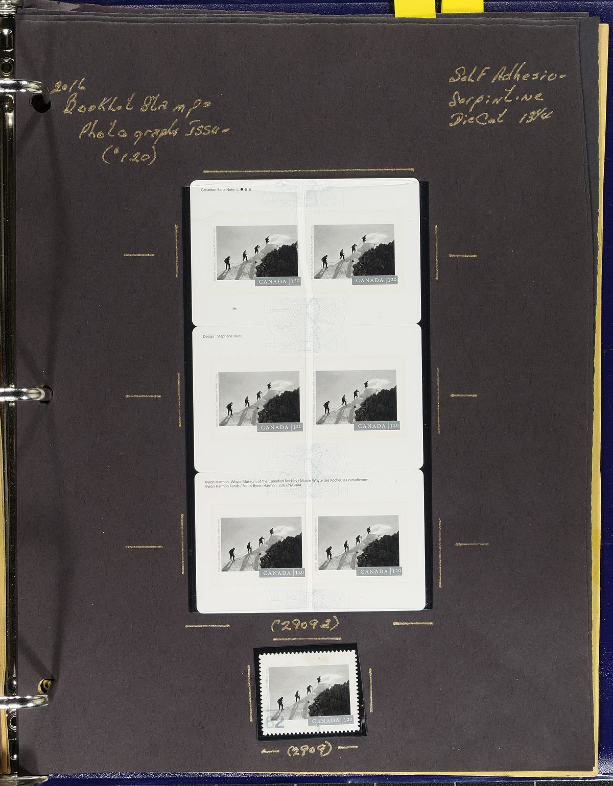 Specialized collection of primarily mint never hinged "Canadian Photography- 4" issues, from April 2016, covering Unitrade #s 2902-2910, all in hingeless mounts in roughly 20 described pages housed in a binder. The collection primarily contains mint and used booklet stamps, complete booklets and part panes, mint and used souvenir sheets, and roughly 10 first day covers (includes a few official first days, with the majority having lower mainland B.C. postmarks). We note some items cataloguing $15 and up. Face value alone totals $123.00 (including 39x "P" stamps). A lovely lot that would be difficult to duplicate. 2024 Unitrade =