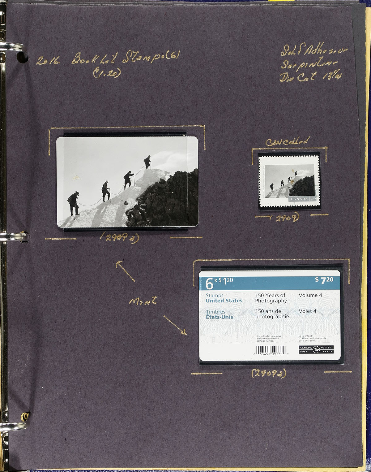 Specialized collection of primarily mint never hinged "Canadian Photography- 4" issues, from April 2016, covering Unitrade #s 2902-2910, all in hingeless mounts in roughly 20 described pages housed in a binder. The collection primarily contains mint and used booklet stamps, complete booklets and part panes, mint and used souvenir sheets, and roughly 10 first day covers (includes a few official first days, with the majority having lower mainland B.C. postmarks). We note some items cataloguing $15 and up. Face value alone totals $123.00 (including 39x "P" stamps). A lovely lot that would be difficult to duplicate. 2024 Unitrade =