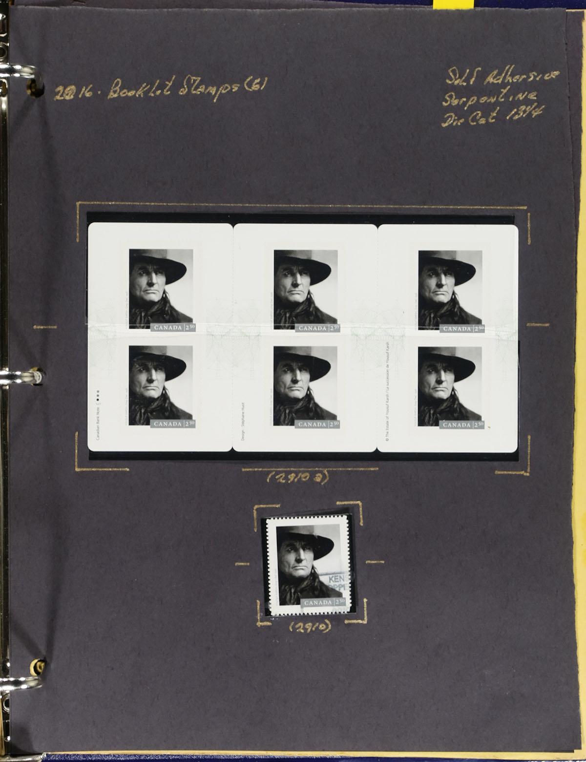 Specialized collection of primarily mint never hinged "Canadian Photography- 4" issues, from April 2016, covering Unitrade #s 2902-2910, all in hingeless mounts in roughly 20 described pages housed in a binder. The collection primarily contains mint and used booklet stamps, complete booklets and part panes, mint and used souvenir sheets, and roughly 10 first day covers (includes a few official first days, with the majority having lower mainland B.C. postmarks). We note some items cataloguing $15 and up. Face value alone totals $123.00 (including 39x "P" stamps). A lovely lot that would be difficult to duplicate. 2024 Unitrade =