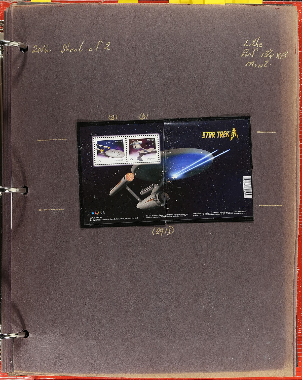Highly specialized collection of primarily mint never hinged "Star Trek" issues, from May 2016, covering Unitrade #s 2911-2922, all in hingeless mounts in roughly 30 well described pages housed in a binder. The collection contains mint and used souvenir sheets, booklets and part panes, mint and used booklet stamps, coil singles, pairs, strips (including gutter strips), mint and used panes from the uncut press sheet, and roughly 15 first day covers (most having lower mainland B.C. postmarks). We note items cataloguing $15 and up. Face value alone totals $135.00 (noting 75x "P" stamps). A near impossible collection to duplicate, ideal for the Canada or topical collector. 2024 Unitrade =