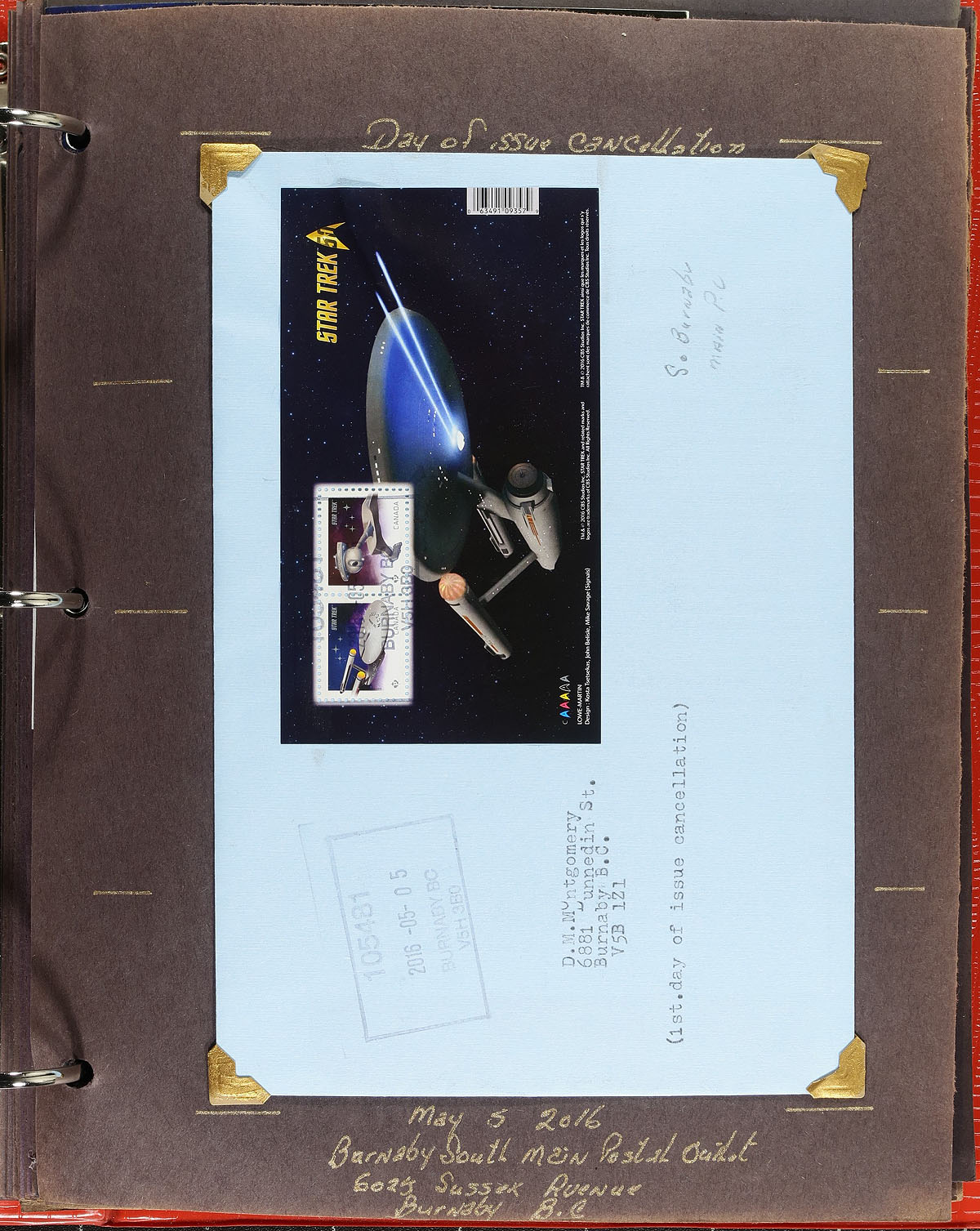 Highly specialized collection of primarily mint never hinged "Star Trek" issues, from May 2016, covering Unitrade #s 2911-2922, all in hingeless mounts in roughly 30 well described pages housed in a binder. The collection contains mint and used souvenir sheets, booklets and part panes, mint and used booklet stamps, coil singles, pairs, strips (including gutter strips), mint and used panes from the uncut press sheet, and roughly 15 first day covers (most having lower mainland B.C. postmarks). We note items cataloguing $15 and up. Face value alone totals $135.00 (noting 75x "P" stamps). A near impossible collection to duplicate, ideal for the Canada or topical collector. 2024 Unitrade =