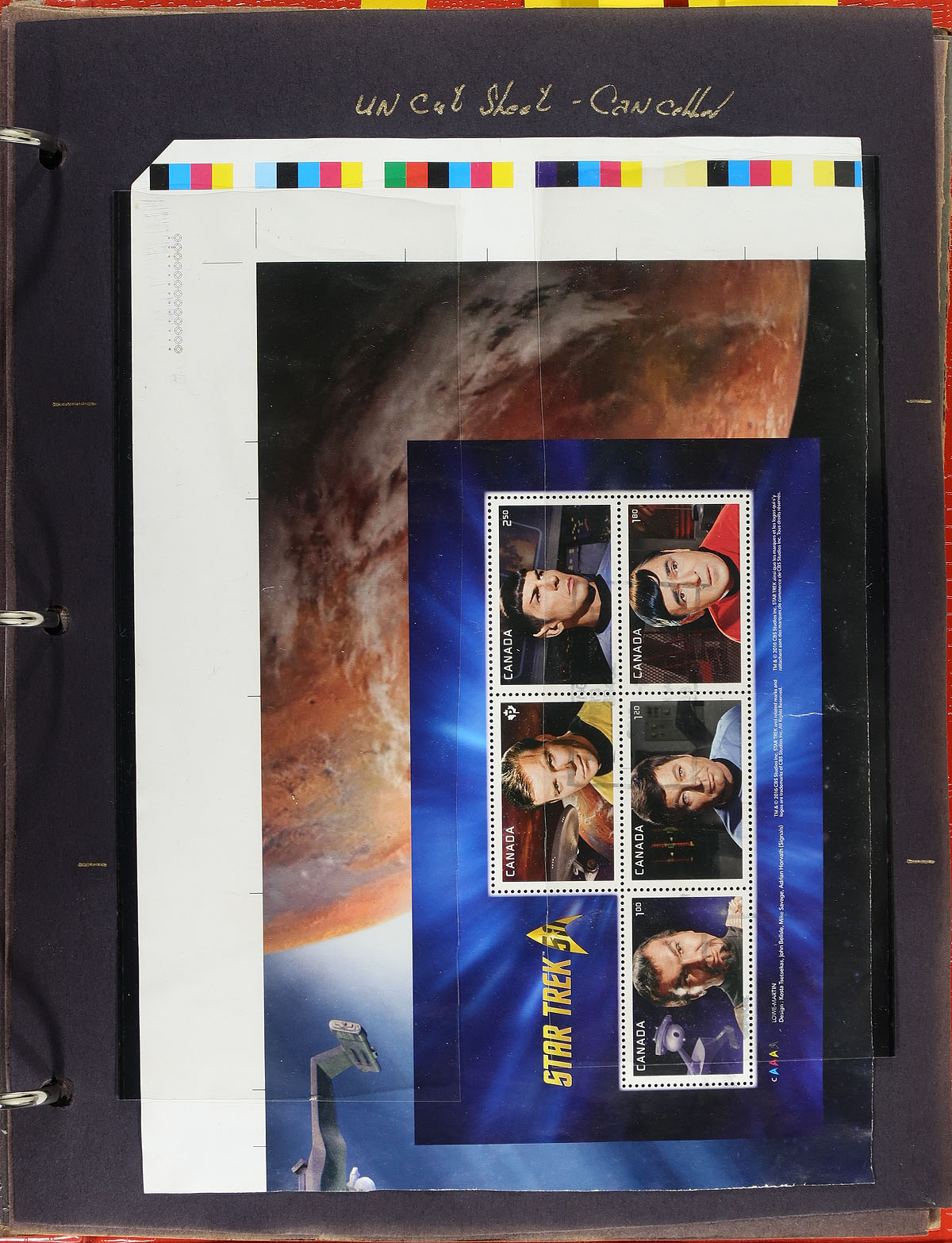 Highly specialized collection of primarily mint never hinged "Star Trek" issues, from May 2016, covering Unitrade #s 2911-2922, all in hingeless mounts in roughly 30 well described pages housed in a binder. The collection contains mint and used souvenir sheets, booklets and part panes, mint and used booklet stamps, coil singles, pairs, strips (including gutter strips), mint and used panes from the uncut press sheet, and roughly 15 first day covers (most having lower mainland B.C. postmarks). We note items cataloguing $15 and up. Face value alone totals $135.00 (noting 75x "P" stamps). A near impossible collection to duplicate, ideal for the Canada or topical collector. 2024 Unitrade =