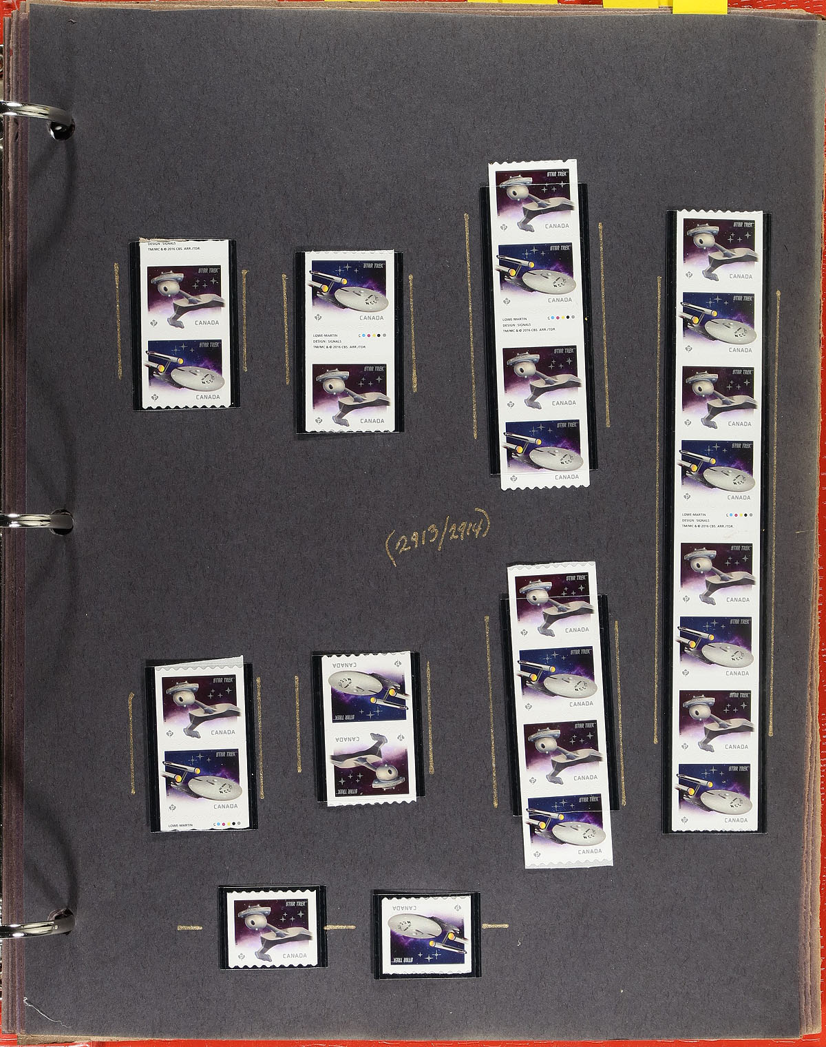Highly specialized collection of primarily mint never hinged "Star Trek" issues, from May 2016, covering Unitrade #s 2911-2922, all in hingeless mounts in roughly 30 well described pages housed in a binder. The collection contains mint and used souvenir sheets, booklets and part panes, mint and used booklet stamps, coil singles, pairs, strips (including gutter strips), mint and used panes from the uncut press sheet, and roughly 15 first day covers (most having lower mainland B.C. postmarks). We note items cataloguing $15 and up. Face value alone totals $135.00 (noting 75x "P" stamps). A near impossible collection to duplicate, ideal for the Canada or topical collector. 2024 Unitrade =