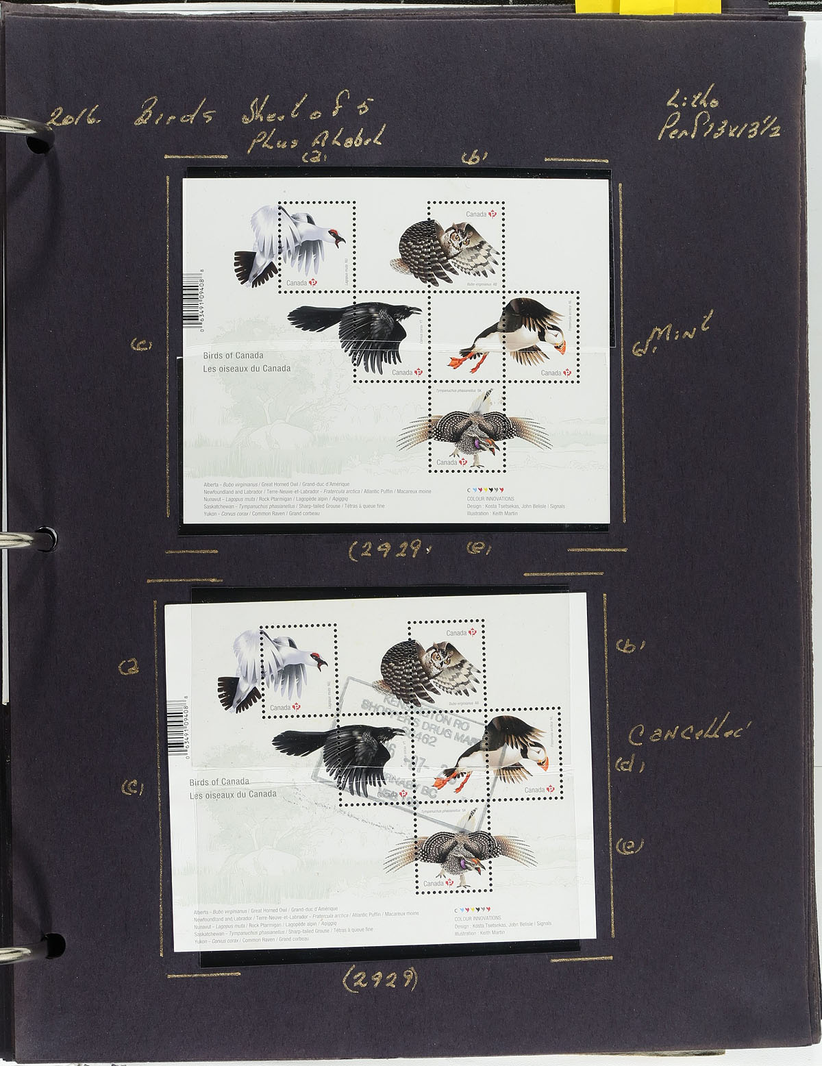 Lovely collection of primarily mint never hinged Canada, from April to September 2016, covering Unitrade #s 2902-2947, all in hingeless mounts in roughly 25 well described pages housed in a binder. The collection primarily contains mint and used booklet stamps, complete booklets and part panes, mint and used souvenir sheets, mint singles, and roughly 10 first day covers (most having lower mainland B.C. postmarks). We note items cataloguing $15 and up. Face value alone totals $188.00 (including 143x "P" stamps). A nice lot for Canada collectors. 2024 Unitrade =