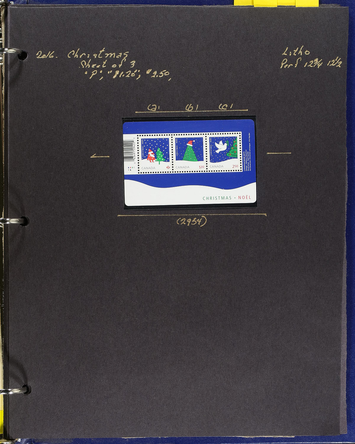 Clean collection of primarily mint never hinged "Christmas" issues, November 2016, covering Unitrade #s 2954-2958, all in hingeless mounts in roughly 12 well described pages housed in a binder. The collection primarily contains booklets, part panes, mint and used booklet singles, souvenir sheet, and a few first day covers (most having lower mainland B.C. postmarks). We note a few items cataloguing $15 and up. Face value alone totals $155.00 (including 81x "P" stamps). A nice offering for the Christmas and Canada collector. 2024 Unitrade =
