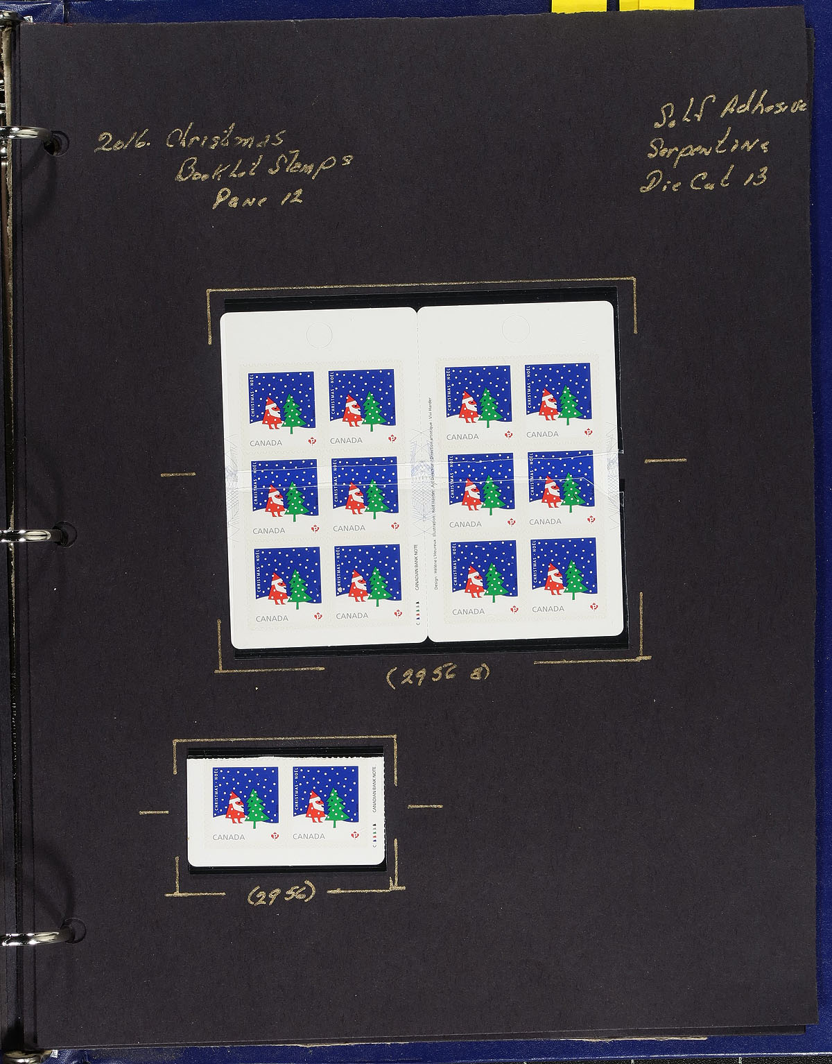 Clean collection of primarily mint never hinged "Christmas" issues, November 2016, covering Unitrade #s 2954-2958, all in hingeless mounts in roughly 12 well described pages housed in a binder. The collection primarily contains booklets, part panes, mint and used booklet singles, souvenir sheet, and a few first day covers (most having lower mainland B.C. postmarks). We note a few items cataloguing $15 and up. Face value alone totals $155.00 (including 81x "P" stamps). A nice offering for the Christmas and Canada collector. 2024 Unitrade =