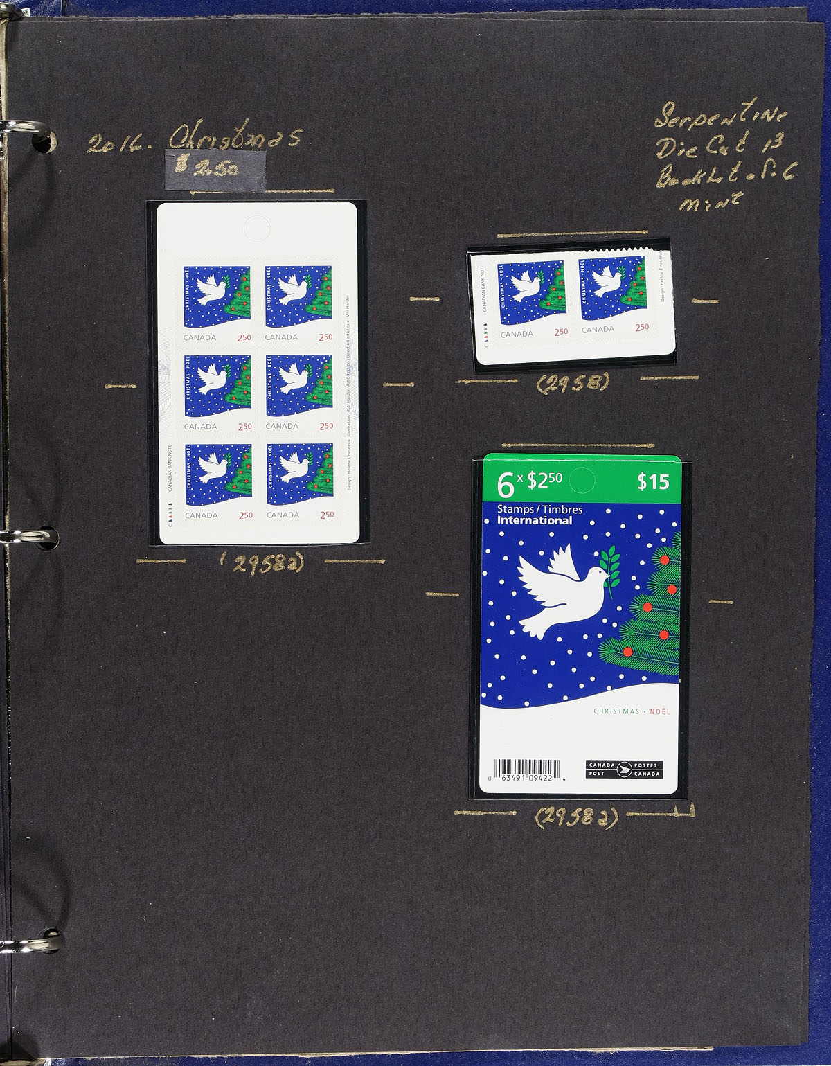 Clean collection of primarily mint never hinged "Christmas" issues, November 2016, covering Unitrade #s 2954-2958, all in hingeless mounts in roughly 12 well described pages housed in a binder. The collection primarily contains booklets, part panes, mint and used booklet singles, souvenir sheet, and a few first day covers (most having lower mainland B.C. postmarks). We note a few items cataloguing $15 and up. Face value alone totals $155.00 (including 81x "P" stamps). A nice offering for the Christmas and Canada collector. 2024 Unitrade =
