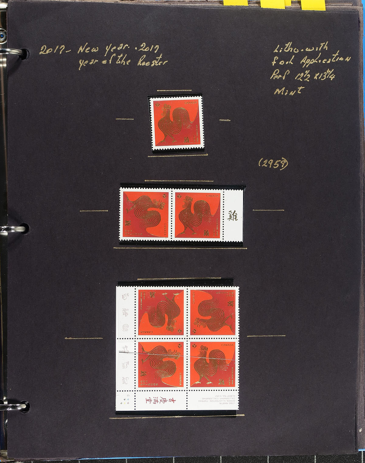 Lovely collection of primarily mint never hinged "Lunar New Year- Year of the Rooster", January 2017, covering Unitrade #s 2959-2962, all in hingeless mounts in roughly 20 well described pages housed in a binder. The collection primarily contains mint and used booklet stamps, sheetlet, plate blocks, mint and used souvenir sheets, booklets, and roughly 10 first day covers (including a matched set of plate block frankings). Face value alone totals $121.00 (including 76x "P" value stamps). A lovely collection for any Canada collector. 2024 Unitrade =