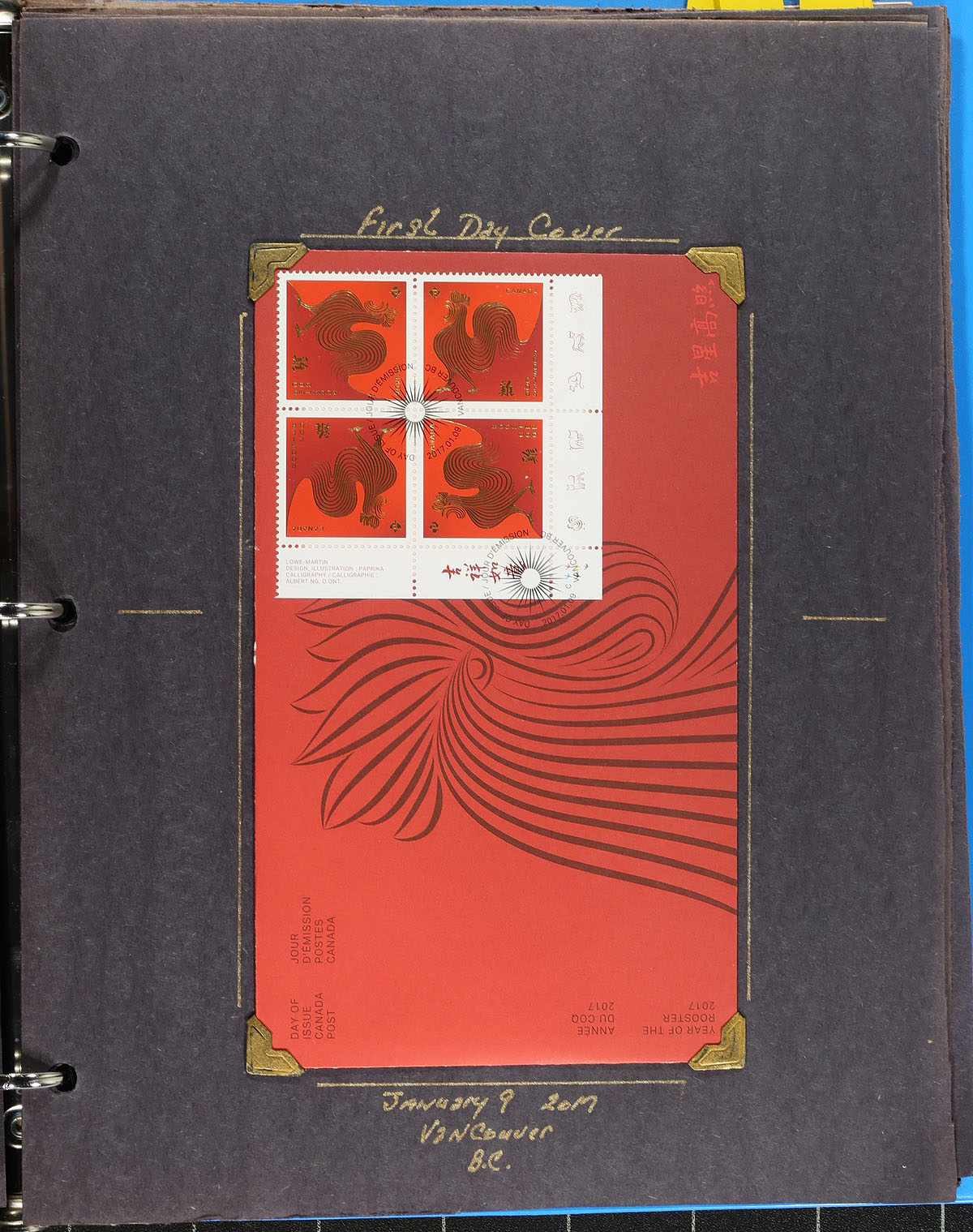 Lovely collection of primarily mint never hinged "Lunar New Year- Year of the Rooster", January 2017, covering Unitrade #s 2959-2962, all in hingeless mounts in roughly 20 well described pages housed in a binder. The collection primarily contains mint and used booklet stamps, sheetlet, plate blocks, mint and used souvenir sheets, booklets, and roughly 10 first day covers (including a matched set of plate block frankings). Face value alone totals $121.00 (including 76x "P" value stamps). A lovely collection for any Canada collector. 2024 Unitrade =