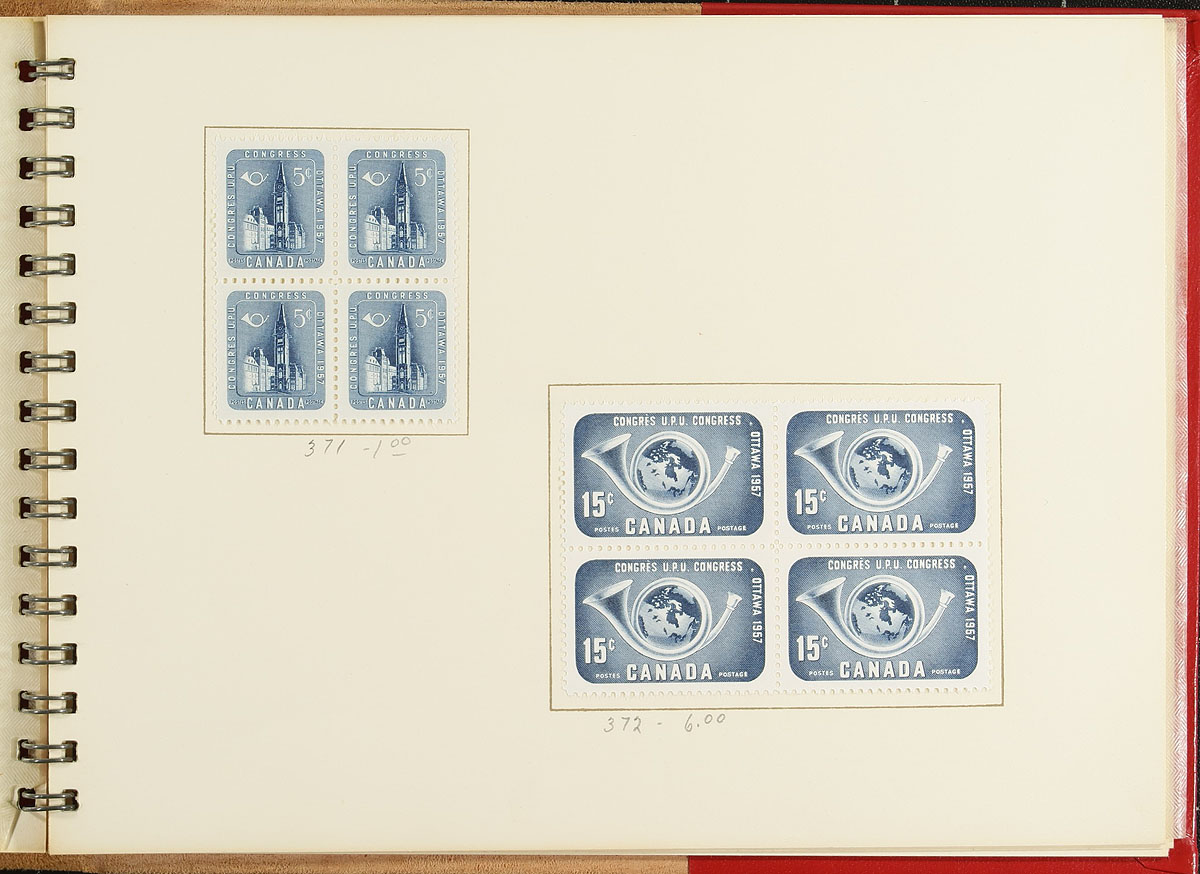The 1957 UPU Congress Official Prestige Presentation Book issued by Canada Post and given out to delegates at the XIV Congress in Ottawa. Contains mint blocks of 32 different commemorative and definitive issues with face values to $1.00. The old Darnell catalogue lists this book as #SP18. Very rare, this is the second we have handled (the first was sold back in 2008!). Estimate =