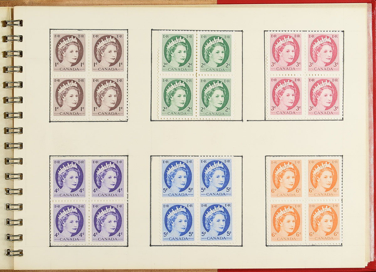 The 1957 UPU Congress Official Prestige Presentation Book issued by Canada Post and given out to delegates at the XIV Congress in Ottawa. Contains mint blocks of 32 different commemorative and definitive issues with face values to $1.00. The old Darnell catalogue lists this book as #SP18. Very rare, this is the second we have handled (the first was sold back in 2008!). Estimate =