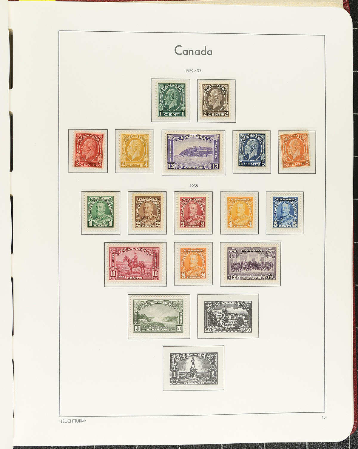 LIGHTHOUSE HINGELESS ALBUM COLLECTION. Primarily mint (hinged and never hinged) collection of Canada in a single red Lighthouse hingeless album with pages for 1851-1975 plus "back of the book". The collection itself ranges from 1870 to 1975, roughly 90-95% complete in period, and includes coil singles and "back of the book" material. The collection begins a 3c Small Queen, then partial set of the Leafs / Numerals, Edwards, Tercentenary, Admirals etc, Expect the earlier to be hinged, eventually transitioning to Never Hinged material in the late George VI/QEII era. Consignor's 2025 total Scott catalogue value totals US$9,238.95 ($12,272.00 CDN)! We note a few faults with the early material, along with some mint stamps having no gum, heavy hinging, or other faults up to the Admiral issues. Still a nice collection with much useful material perfect to build upon, integrate into your own collection or break apart. Well worth our conservative estimate. Estimate =