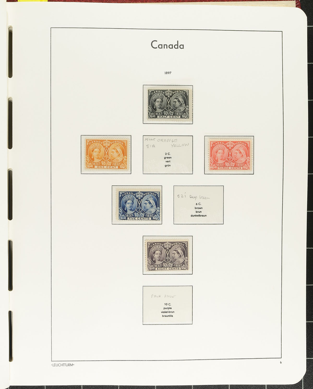 LIGHTHOUSE HINGELESS ALBUM COLLECTION. Primarily mint (hinged and never hinged) collection of Canada in a single red Lighthouse hingeless album with pages for 1851-1975 plus "back of the book". The collection itself ranges from 1870 to 1975, roughly 90-95% complete in period, and includes coil singles and "back of the book" material. The collection begins a 3c Small Queen, then partial set of the Leafs / Numerals, Edwards, Tercentenary, Admirals etc, Expect the earlier to be hinged, eventually transitioning to Never Hinged material in the late George VI/QEII era. Consignor's 2025 total Scott catalogue value totals US$9,238.95 ($12,272.00 CDN)! We note a few faults with the early material, along with some mint stamps having no gum, heavy hinging, or other faults up to the Admiral issues. Still a nice collection with much useful material perfect to build upon, integrate into your own collection or break apart. Well worth our conservative estimate. Estimate =