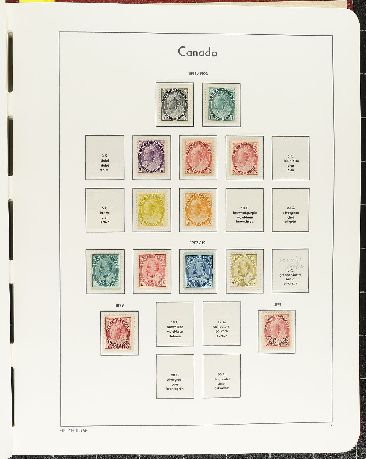 LIGHTHOUSE HINGELESS ALBUM COLLECTION. Primarily mint (hinged and never hinged) collection of Canada in a single red Lighthouse hingeless album with pages for 1851-1975 plus "back of the book". The collection itself ranges from 1870 to 1975, roughly 90-95% complete in period, and includes coil singles and "back of the book" material. The collection begins a 3c Small Queen, then partial set of the Leafs / Numerals, Edwards, Tercentenary, Admirals etc, Expect the earlier to be hinged, eventually transitioning to Never Hinged material in the late George VI/QEII era. Consignor's 2025 total Scott catalogue value totals US$9,238.95 ($12,272.00 CDN)! We note a few faults with the early material, along with some mint stamps having no gum, heavy hinging, or other faults up to the Admiral issues. Still a nice collection with much useful material perfect to build upon, integrate into your own collection or break apart. Well worth our conservative estimate. Estimate =